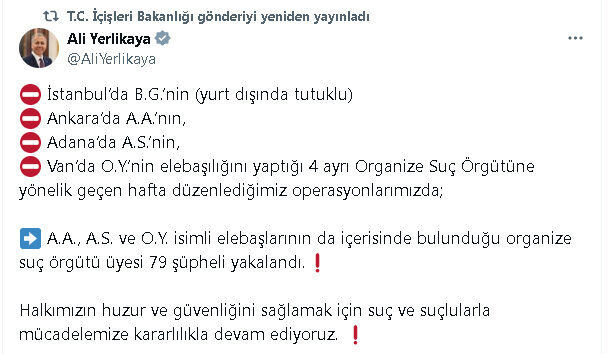 Bakan Yerlikaya’nın sosyal medya hesabından yaptığı açıklamaya göre; İstanbul’da yurt dışında tutuklu bulunan B.G.’nin, Ankara’da A.A.’nın, Adana’da A.S.’nin, Van’da O.Y.’nin elebaşılığını yaptığı 4 ayrı organize suç örgütüne yönelik geçen hafta 4 ilde operasyonlar düzenlendi. Operasyonlarda A.A., A.S. ve O.Y. isimli elebaşlarının da içerisinde bulunduğu organize suç örgütü üyesi 79 şüpheli yakalandı. Ayrıca, 7 ruhsatsız tabanca, 3 ruhsatsız tüfek, 1 otomatik tabanca, 2 el bombası ile muhtelif miktarda uyuşturucu madde ele geçirildi.