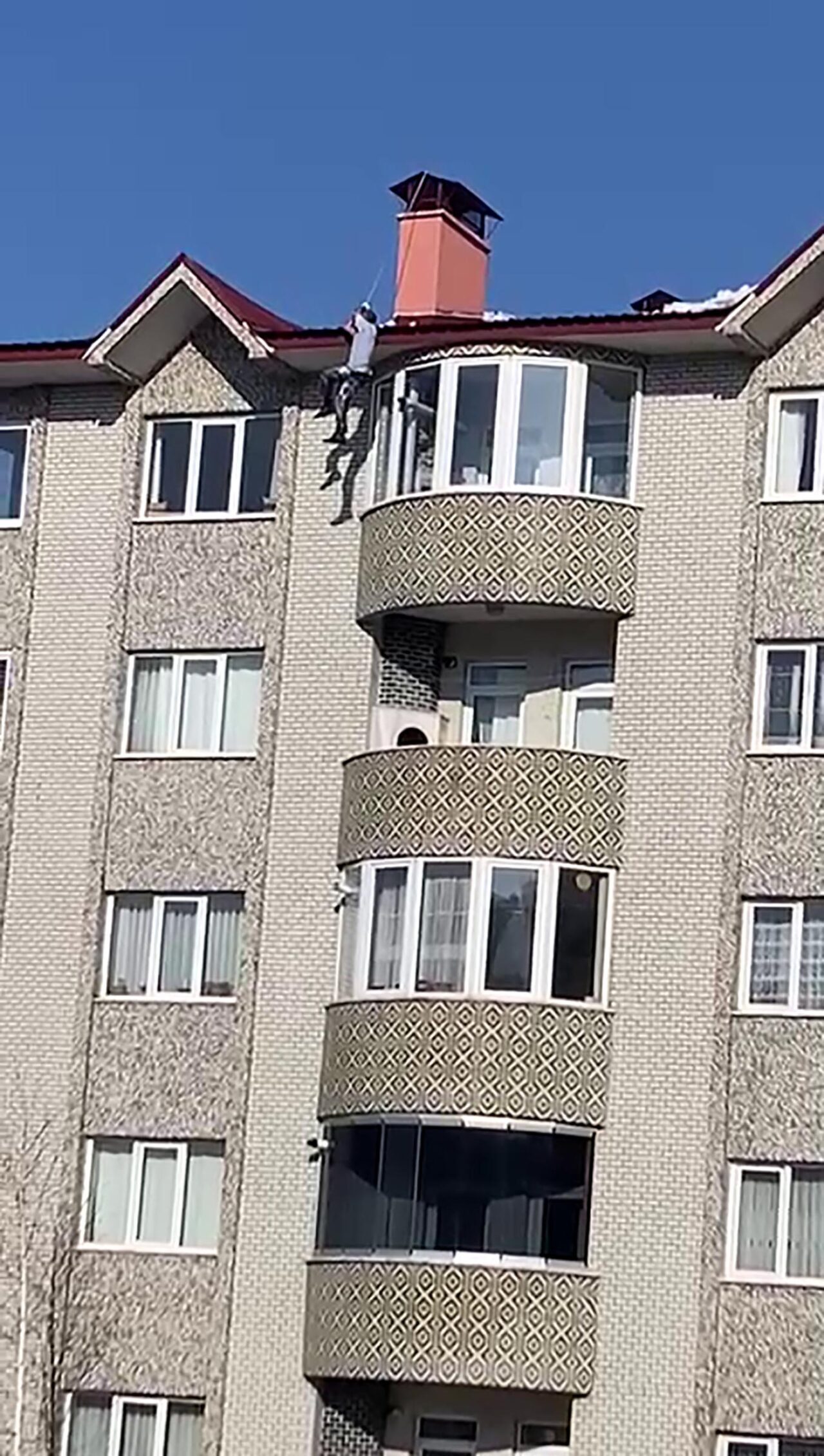 Oktay POLAT/ERZURUM, – ERZURUM’da 6 katlı binanın çatısındaki karı temizlerken ayağı kayan 3 çocuk babası Hüseyin Ergün (51), beline bağladığı iple düşmekten kurtuldu. Binanın bacasına sardığı ipin bir ucunu da beline dolayan Ergün, “5 dakika asılı kaldım. Hayatım film şeridi gibi gözümün önünden geçti” dedi.