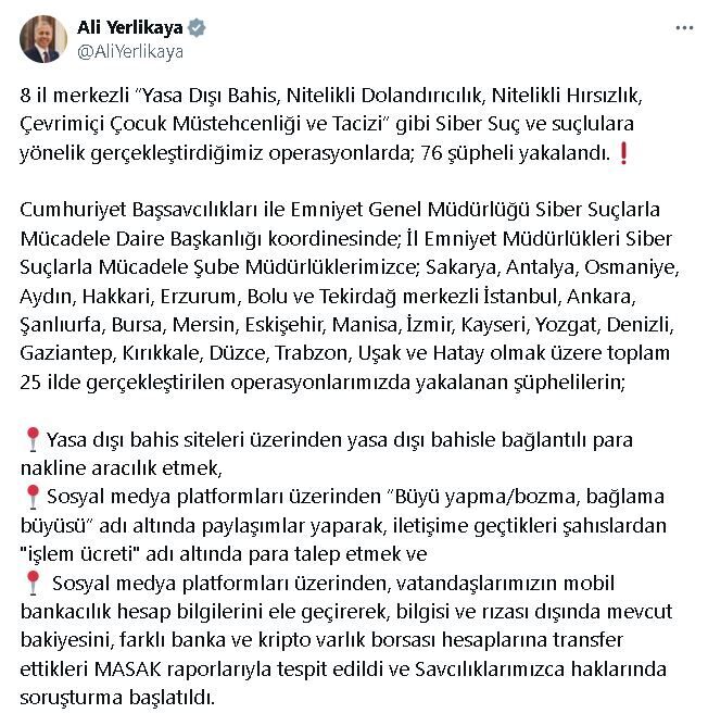 ANKARA, – İÇİŞLERİ Bakanı Ali Yerlikaya, 8 il merkezli siber suç ve suçlulara yönelik operasyonlarda 76 şüphelinin yakalandığını açıkladı.
