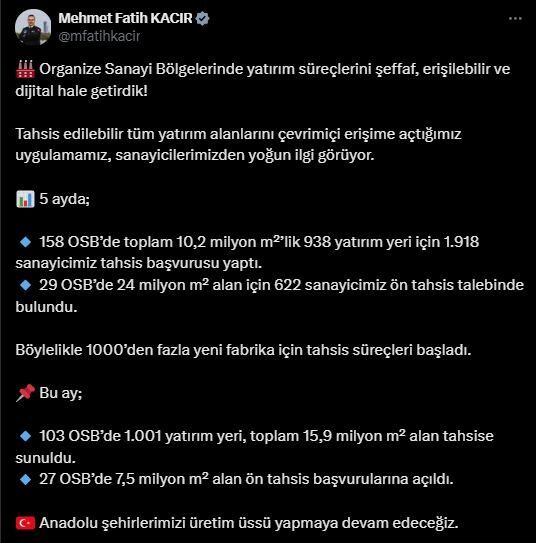 Bakan Kacır, ayrıca sosyal medya hesabından konuya ilişkin yaptığı paylaşımda, “Organize sanayi bölgelerinde yatırım süreçlerini şeffaf, erişilebilir ve dijital hale getirdik. Tahsis edilebilir tüm yatırım alanlarını çevrim içi erişime açtığımız uygulamamız, sanayicilerimizden yoğun ilgi görüyor. 5 ayda 158 OSB’de toplam 10,2 milyon metrekarelik 938 yatırım yeri için 1918 sanayicimiz tahsis başvurusu yaptı. 29 OSB’de 24 milyon metrekare alan için 622 sanayicimiz ön tahsis talebinde bulundu. Böylelikle binden fazla yeni fabrika için tahsis süreçleri başladı. Bu ay; 103 OSB’de 1001 yatırım yeri, toplam 15,9 milyon metrekare alan tahsise sunuldu. 27 OSB’de 7,5 milyon metrekare alan ön tahsis başvurularına açıldı. Anadolu şehirlerimizi üretim üssü yapmaya devam edeceğiz” dedi.