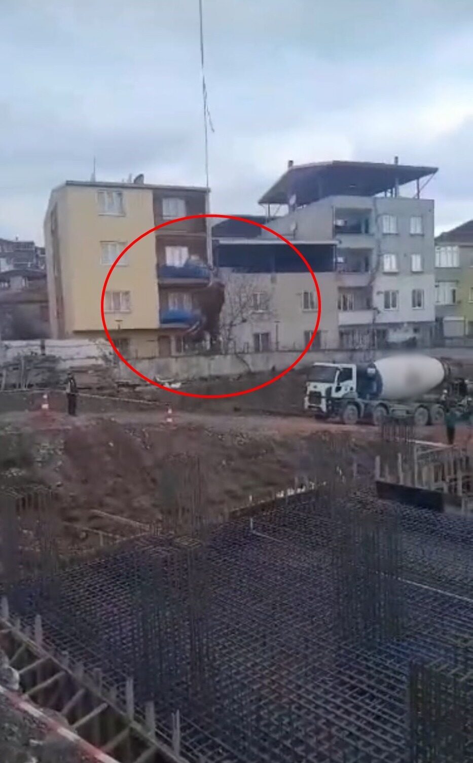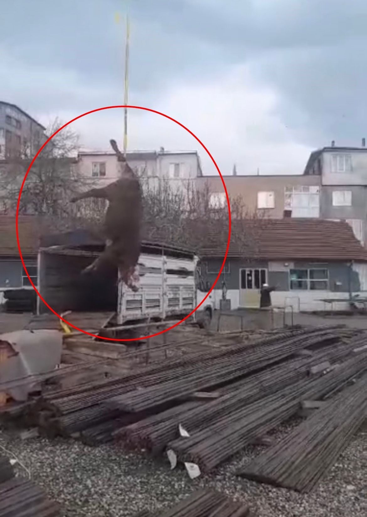 Yıldırım ilçesinde yapımına başlanan sitenin inşaatı için temel atılacağı sırada kesilmek için alana kamyonetle boğa getirildi. Arka ayağından vincin halatına bağlanan hayvan, baş aşağı kesileceği alana taşındı. O anlar ise çevredekiler tarafından cep telefonuyla kaydedildi.