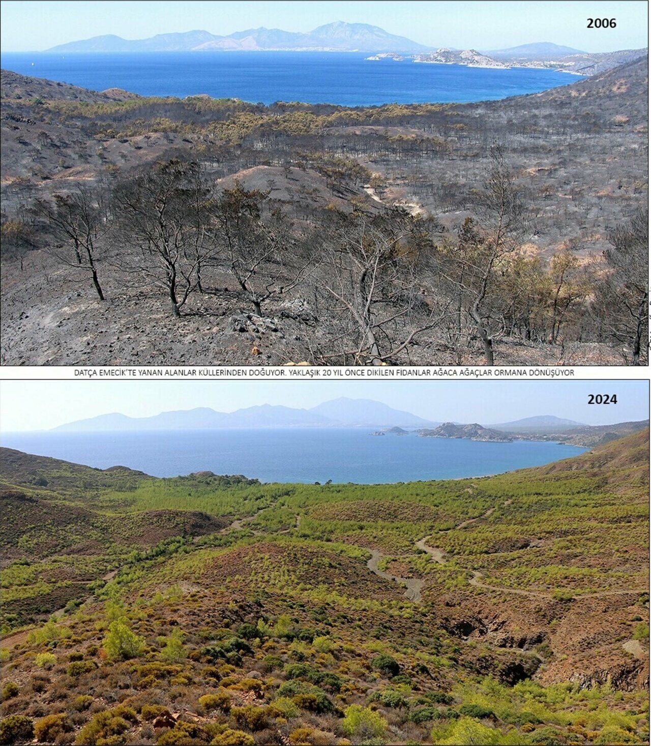 Datça Emecik’te 2006 Eylül’de orman yangını çıktı. Emecik sahil kısmında etkili olan yangında yaklaşık 400 hektar alan zarar gördü. Yangının ardından bölgede ağaçlandırma çalışmalarına hemen başlandı. Yanan alanın büyük kısmı fidan dikilip, ağaçlandırıldı. Emecik’te 19 yıl önce dikilen fidanlar ağaca, ağaçlar ormana dönüştü. Muğla Orman Bölge Müdürlüğü tarafından öncesi ve sonrası olarak paylaşılan fotoğraflarda alanın tamamen yeşile döndüğü görüldü.