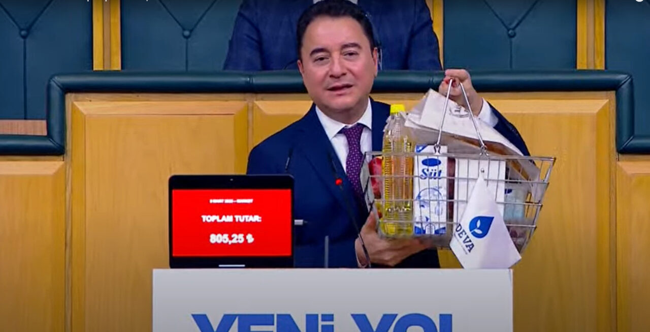 Babacan, kürsünün üzerine yazar kasa koyarak gıda ürünlerinin 2018 yılındaki fiyatları ile günümüzdeki fiyatlarını hesapladı. Babacan, “Bundan 6,5 yıl önce markete gidip, bu sepete 200 lira verip, 100 lira alabiliyordunuz. Şimdi 200 yetmiyor, 800 lira alışveriş ile marketten çıkabiliyorsunuz. Geldiğimiz nokta bu, fiyatlar tam 8 kat artmış. Son 6,5 yılda şu ramazan sepetimiz 8 kat artmış. Sayın Erdoğan’ın karnesi, milletin verdiği karne bu. ‘Ben enflasyon ile mücadele edeceğim, yetkiyi verin, görün nasıl çözeceğim’ diyen Erdoğan’ın ülkeyi getirdiği nokta işte budur” dedi.