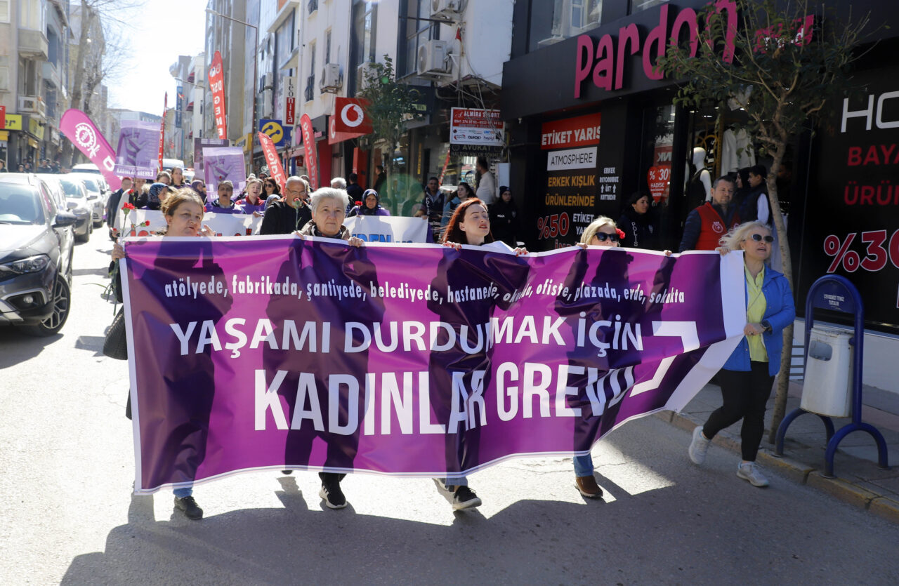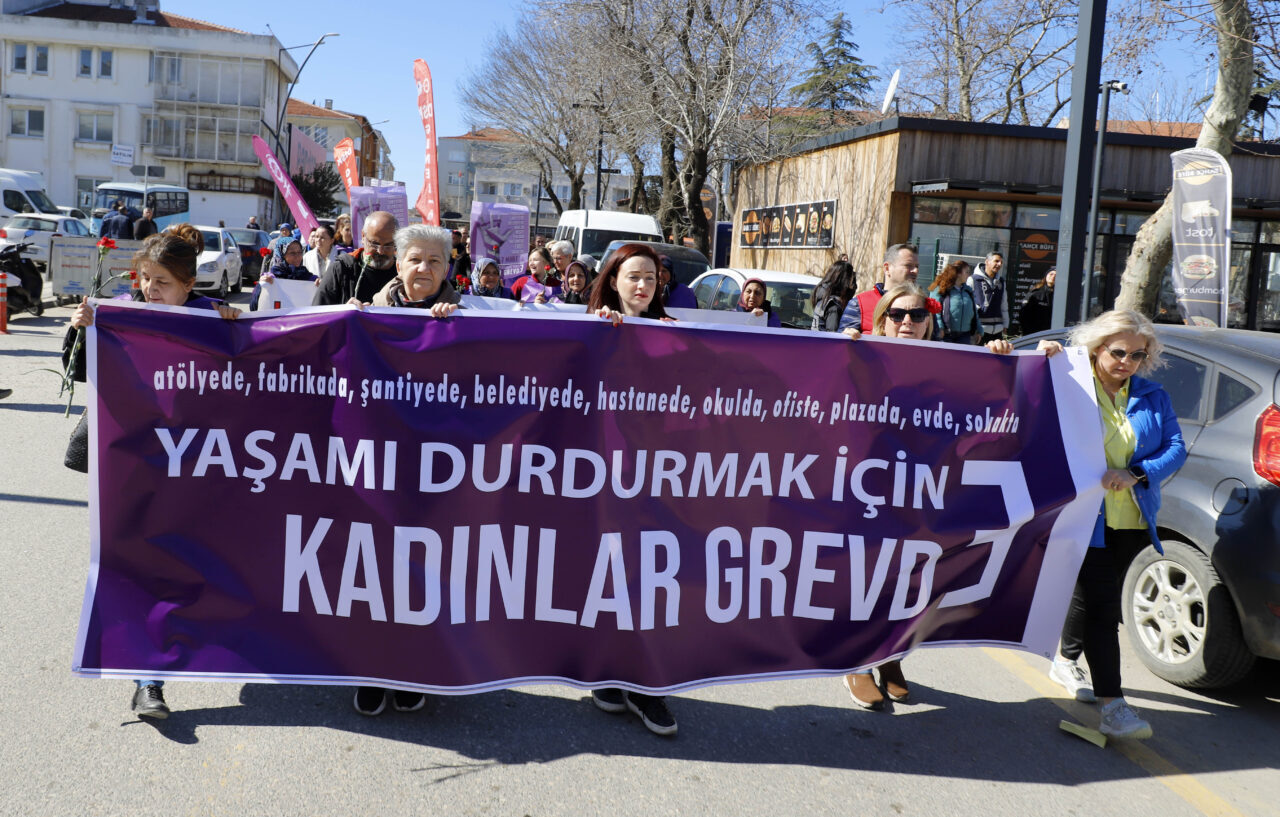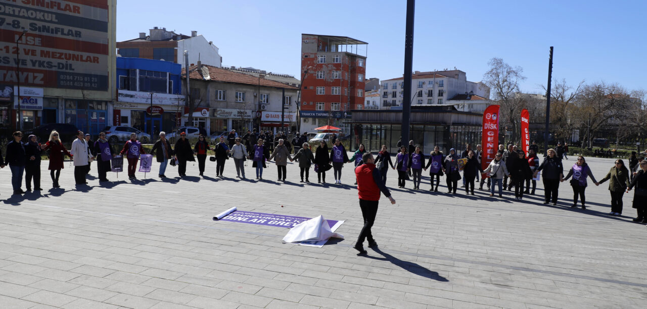 ‘Yaşamı durdurmak için kadınlar grevde’ sloganıyla DİSK öncülüğünde düzenlenen etkinlikte, sendikaya bağlı çalışan kadınlar, ‘8 Mart Dünya Kadınlar Günü’ nedeniyle 1 günlük iş bırakarak, yürüyüş yaptı. Keşan Belediyesi Çok Amaçlı Pazaryeri Kompleksi’nde toplanan kadınlar, ellerinde taşıdıkları dövizlerle sloganlar atıp Cumhuriyet Meydanı’na yürüdü. Konuya ilişkin basın açıklamasını okuyan Keşan Belediyesi personeli Berna Adalılar, “Biz kadınlar, 8 Mart’a giderken hayat pahalılığına, düşük ücretlere, güvencesiz istihdam politikalarına ve ayrımcılığa karşı itiraz sesimizi yeniden yükseltiyoruz. Hem çalışma hayatında hem de görünmeyen ev içi emeğimizdeki eşitsizliklere, güvencesizliğe, baskılara, şiddet ve tacize karşı birlikte duruyoruz. Kadınların üzerindeki bakım yükünü alacak kamusal sosyal politikaların hayata geçirilmesini istiyoruz. Anne desteği değil ebeveyn desteği talep ediyoruz. Gebelik izni değil, ebeveynlik izni istiyoruz. Doğum teşviki değil nitelikli, kamusal, ücretsiz kreş istiyoruz. Bizim için düzenli ve güvenceli istihdam istiyoruz. Biz kadınlar, haklarımızı savunuyor, eşitlik, özgürlük ve adalet için sesimizi yükseltiyoruz. Kazanılmış haklarımıza saldıranlara karşı eşitlik, özgürlük ve adalet taleplerimizle yaşamı durduruyoruz” dedi.