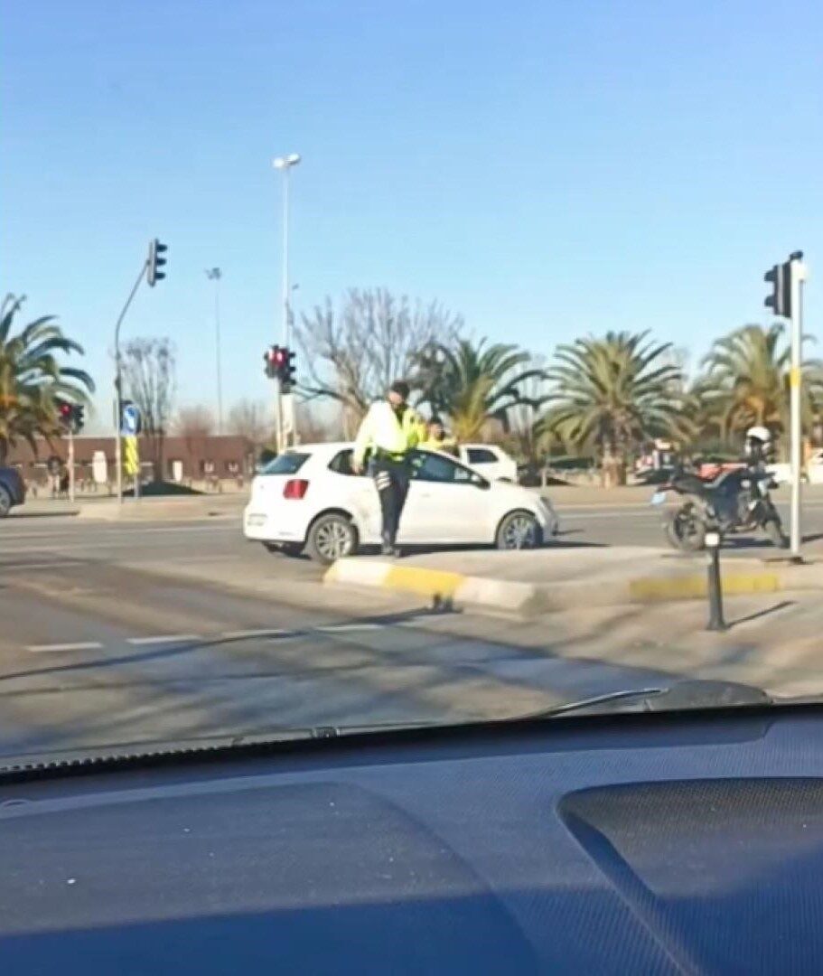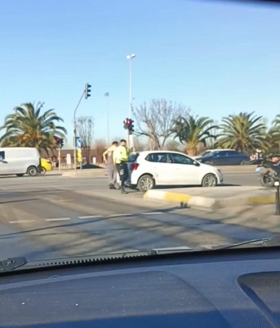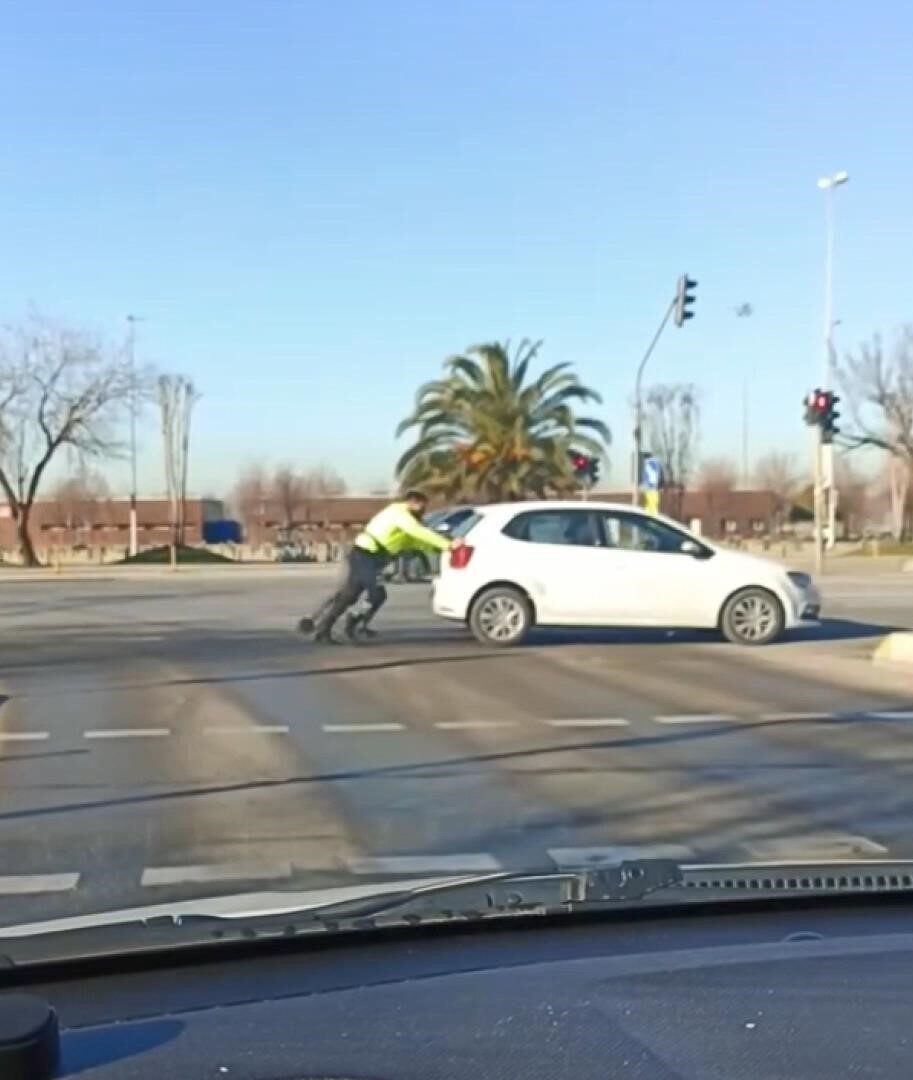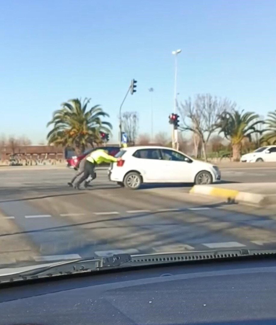 Olay, saat 09.00 sıralarında Mimar Sinan ışıklar mevkiinde meydana geldi. Edinilen bilgiye göre sahilyolunda bir otomobil hasarlı kazaya karıştı. Olay yerine gelen trafik polisi A.B. kaza sonrası arızalanan aracı, trafiğe engel olmaması için park görevlisiyle iterek yol kenarına aldı. O anlar cep telefonu kamerasına yansıdı.