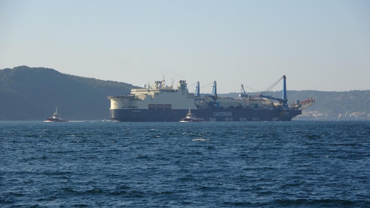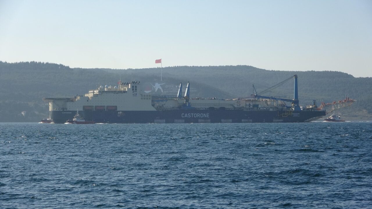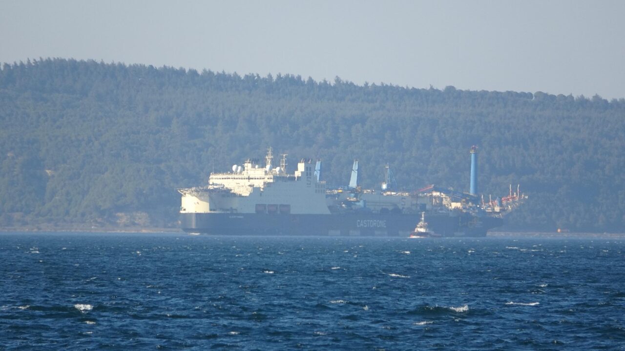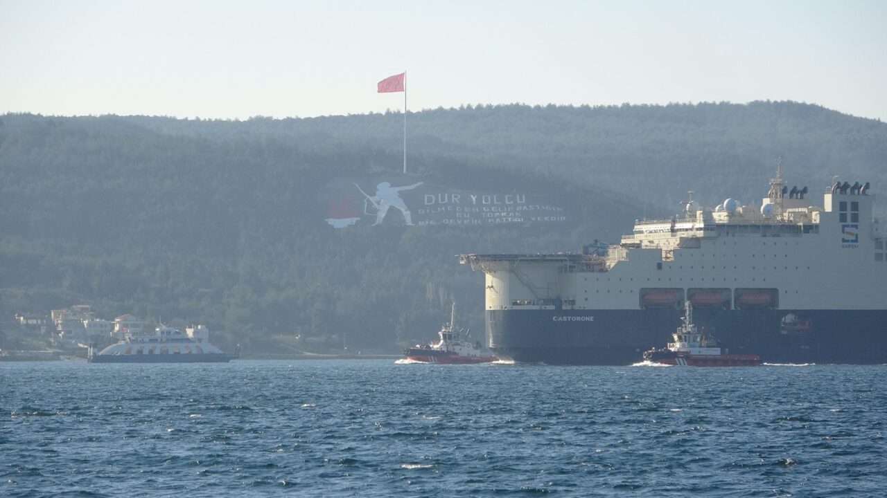 Karadeniz’de bulunan doğal gazın taşınması için derin sularda boru serim işlemi yapan ‘Castorone’ isimli gemi, Çanakkale Boğazı’ndan geçti. İstanbul’dan İtalya’ya giden Bahama Adaları bayraklı 325 metre uzunluğunda ve 39 metre genişliğinde, 102 bin 32 groston ağırlığındaki gemi, saat 14.30’da Marmara Denizi’nden Çanakkale Boğazı’na giriş yaptı. Saat 17.00 sıralarında Çanakkale önlerinde olan geminin geçişi sırasında Çanakkale Boğazı güney-kuzey yönlü saat 05.30 ile 17.00 arası trafiğe kapatıldı. Gemiye, boğaz geçişi sırasında ‘Kurtarma-15’, ‘Kurtarma-18’, ‘Kurtarma-20’ ve ‘Türkeli’ römorkörleri eşlik etti. Boğazdan çıkan gemi, Ege Denizi’ne doğru yol aldı.