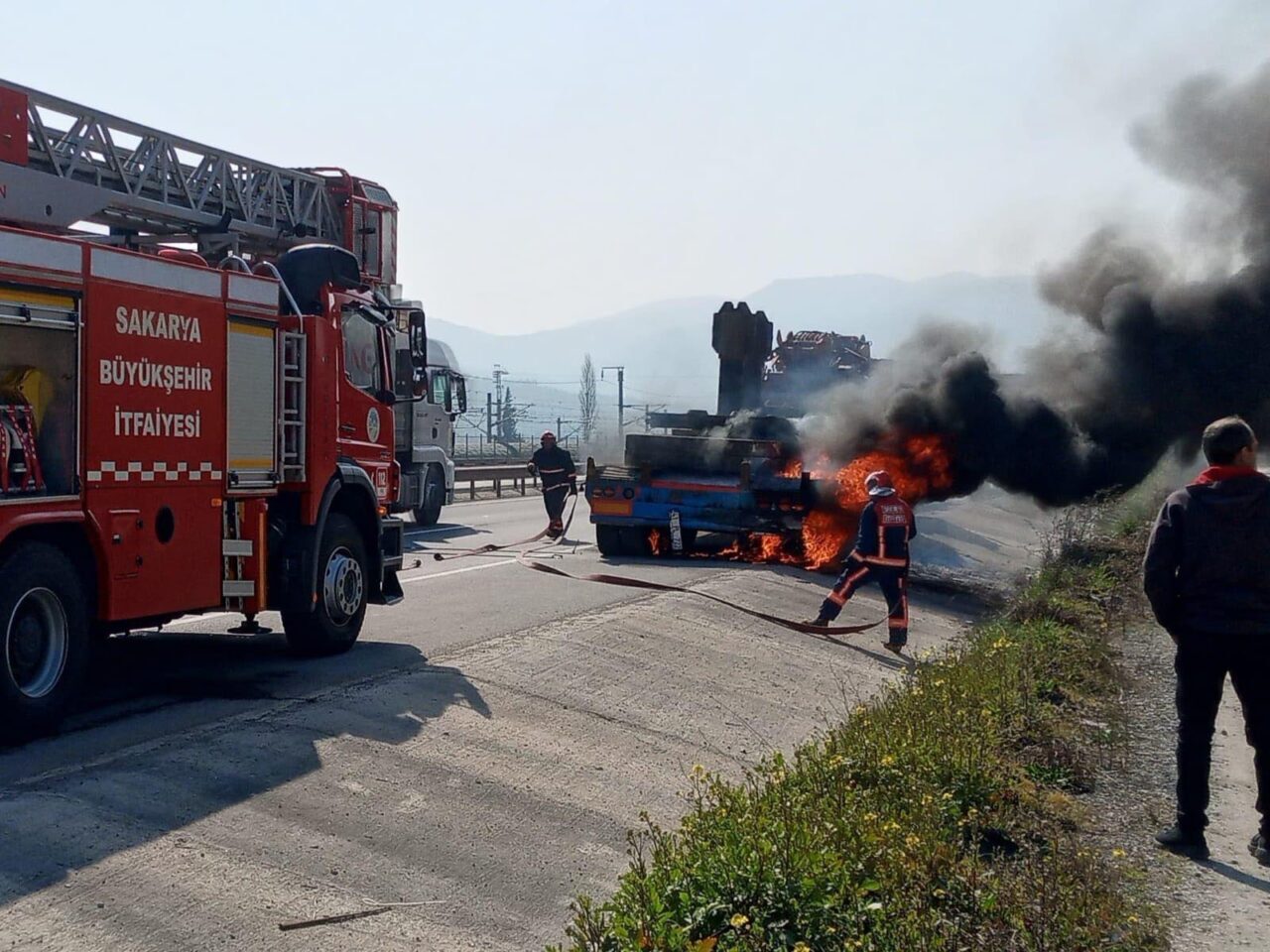Adapazarı yönünden Bilecik yönüne giden 41 PL 722 plakalı iş makinesi yüklü TIR, öğle saatlerinde D-650 kara yolunun Pamukova Mekece Mahallesi mevkiine geldiğinde lastikleri tutuştu. Şoför, aracını emniyet şeridine çekerek itfaiyeye haber verdi. Gelen itfaiye ekipleri, kısa sürede dorseyi saran alevlere müdahale ederek söndürdü.