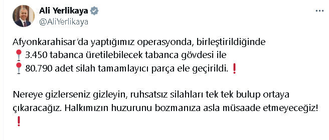 Bakan Yerlikaya’nın sosyal medya hesabından yaptığı açıklamaya göre; Afyonkarahisar Cumhuriyet Başsavcılığı koordinasyonunda, ‘Yasa dışı silah imalatı’ ve ‘Silah kaçakçılığı’ suçlarına yönelik Afyonkarahisar Emniyet Müdürlüğü ve Konya Emniyet Müdürlüğünce yapılan ortak çalışmalar sonucu, şüphe üzerine bir araç durduruldu. Aracın içerisinde yapılan aramada; 3 bin 450 tabanca gövdesi ve 80 bin 790 silah tamamlayıcı parça ele geçirildi. Operasyonda 3 şüpheli yakalandı, 2’si ‘Silah ve mühimmat kaçakçılığı’ suçundan çıkarıldığı mahkemece tutuklandı ve 1’i hakkında adli kontrol kararı verildi.