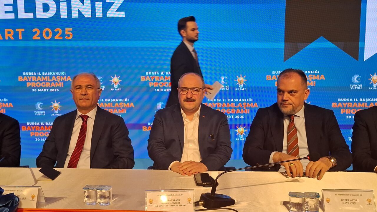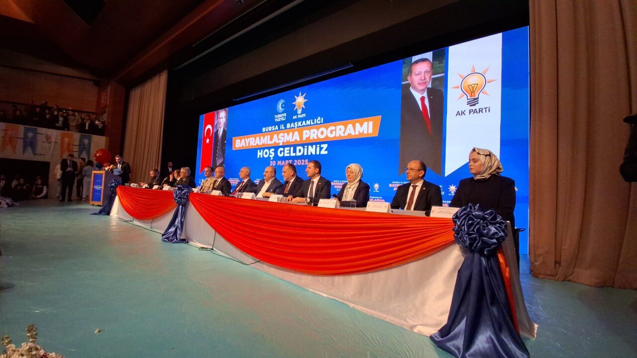 AK Parti Bursa İl Başkanlığı’nın Merinos Atatürk Kongre ve Kültür Merkezi’nde gerçekleşen bayramlaşma törenine, AK Parti Genel Başkanvekili Efkan Ala, TBMM Sanayi, Ticaret, Enerji, Tabii Kaynaklar, Bilgi ve Teknoloji Komisyonu Başkanı Mustafa Varank, eski başbakan yardımcısı Hakan Çavuşoğlu, AK Parti Genel Merkez Ekonomi İşleri Başkan Yardımcısı Önder Matlı, AK Parti Bursa milletvekilleri, AK Parti Artvin Milletvekili Faruk Çelik, ilçe belediye başkanları, il kadın kolları, gençlik kolları, geçmiş dönem milletvekilleri, geçmiş dönem belediye başkanları, meclis üyeleri, sivil toplum kuruluşlarının temsilcileri ve partililer katıldı. Cumhurbaşkanı Recep Tayyip Erdoğan’ın bayram mesajının dinlenmesiyle başlayan törende konuşan AK Parti Genel Başkanvekili Efkan Ala, “Biz, bu coğrafyada güçlü ve istikrarlı bir Türkiye inşa etmenin peşindeyiz. Türkiye’yi prangalarından kurtararak, hedeflerine odaklanmasını sağlamak istiyoruz. Güçlü bir şekilde bölgemizde ve dünyada olup biten haksızlıklara karşı duralım, yeniden kurulmakta olan dünyada, Türkiye’yi büyük bir devlet olarak konumlandıralım ve bu süreçte daha fazla inisiyatif alalım” ifadelerini kullandı.