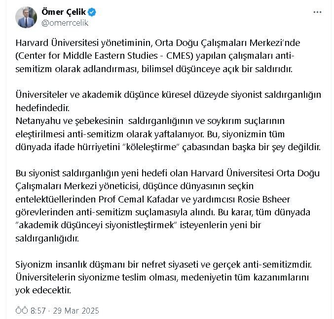 AK Parti’li Çelik, sosyal medya hesabından yaptığı açıklamada, “Harvard Üniversitesi yönetiminin, Orta Doğu Çalışmaları Merkezi’nde yapılan çalışmaları anti-semitizm olarak adlandırması, bilimsel düşünceye açık bir saldırıdır. Üniversiteler ve akademik düşünce, küresel düzeyde siyonist saldırganlığın hedefindedir. Netanyahu ve şebekesinin saldırganlığının ve soykırım suçlarının eleştirilmesi, anti-semitizm olarak yaftalanıyor. Bu, siyonizmin tüm dünyada ifade hürriyetini köleleştirme çabasından başka bir şey değildir. Bu siyonist saldırganlığın yeni hedefi olan Harvard Üniversitesi Orta Doğu Çalışmaları Merkezi yöneticisi, düşünce dünyasının seçkin entelektüellerinden Cemal Kafadar ve yardımcısı Rosie Bsheer görevlerinden anti-semitizm suçlamasıyla alındı. Bu karar, tüm dünyada akademik düşünceyi siyonistleştirmek isteyenlerin yeni bir saldırganlığıdır. Siyonizm, insanlık düşmanı bir nefret siyaseti ve gerçek anti-semitizmdir. Üniversitelerin siyonizme teslim olması, medeniyetin tüm kazanımlarını yok edecektir” ifadelerini kullandı.