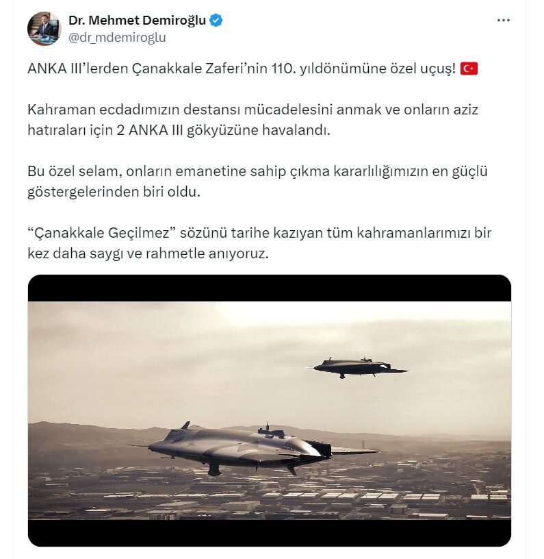 TUSAŞ Genel Müdürü Mehmet Demiroğlu, ANKA 3’lerin gerçekleştirdiği özel uçuşun görüntülerini sosyal medya hesabından paylaşarak, “Kahraman ecdadımızın destansı mücadelesini anmak ve onların aziz hatıraları için 2 ‘ANKA 3’ gökyüzüne havalandı. Bu özel selam, onların emanetine sahip çıkma kararlılığımızın en güçlü göstergelerinden biri oldu. ‘Çanakkale Geçilmez’ sözünü tarihe kazıyan tüm kahramanlarımızı bir kez daha saygı ve rahmetle anıyoruz” dedi.