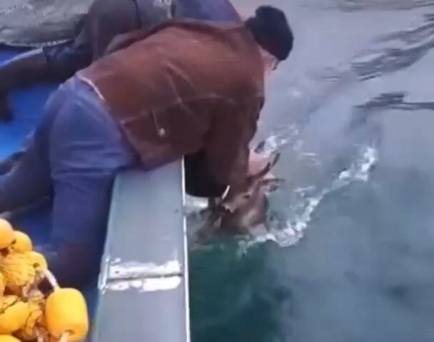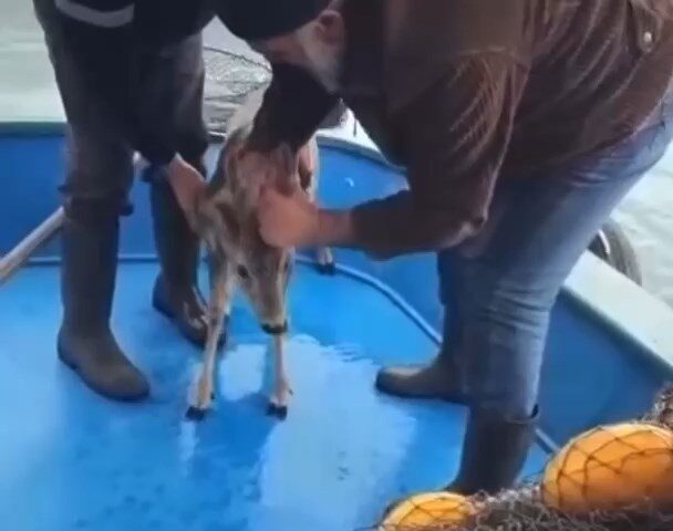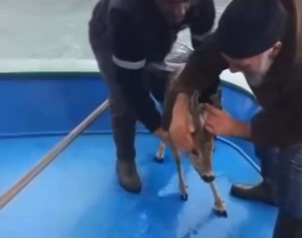 Hopa’da sabah saatlerinde denize açılan amatör balıkçılar, suda yüzen karacayı fark etti. Balıkçılar, yorulan ve bitkin düşen karacayı balıkçı kepçesi ile yakalayıp boynuzlarından tutarak tekneye aldı. Karacayı seven balıkçılar kaçmasını engellemek için ayaklarını bağlayıp kıyıya çıkardı. Kurtarılma anı ise balıkçılar tarafından telefonla kayda alındı.