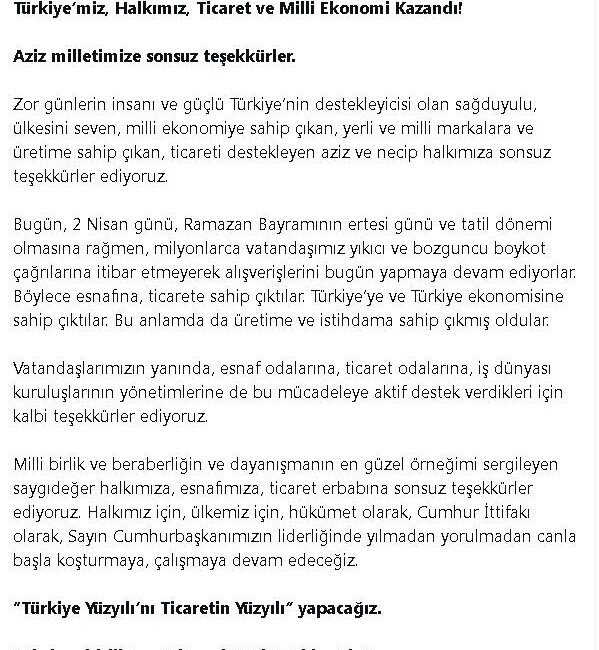 Ticaret Bakanı Ömer Bolat, boykot çağrılarına ilişkin sosyal medya hesabından açıklama yaptı. Bolat, “Türkiye’miz, halkımız, ticaret ve milli ekonomi kazandı. Aziz milletimize sonsuz teşekkürler. Zor günlerin insanı ve güçlü Türkiye’nin destekleyicisi olan sağduyulu, ülkesini seven, milli ekonomiye sahip çıkan, yerli ve milli markalara ve üretime sahip çıkan, ticareti destekleyen aziz ve necip halkımıza sonsuz teşekkürler ediyoruz. Bugün, 2 Nisan günü, Ramazan Bayramı’nın ertesi günü ve tatil dönemi olmasına rağmen, milyonlarca vatandaşımız yıkıcı ve bozguncu boykot çağrılarına itibar etmeyerek alışverişlerini bugün yapmaya devam ediyorlar. Böylece esnafına, ticarete sahip çıktılar. Türkiye’ye ve Türkiye ekonomisine sahip çıktılar. Bu anlamda da üretime ve istihdama sahip çıkmış oldular” dedi.
