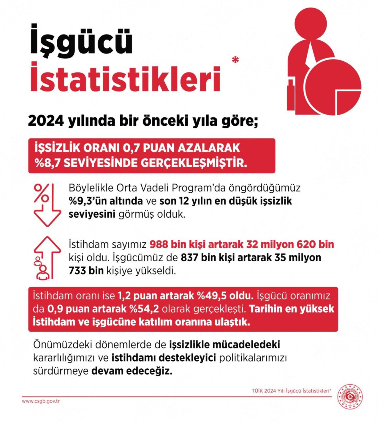 Çalışma ve Sosyal Güvenlik Bakanı Vedat Işıkhan, iş gücü istatistiklerine ilişkin sosyal medya hesabından yaptığı açıklamada, “TÜİK tarafından açıklanan 2024 yılı iş gücü istatistikleri ile işsizlik oranı, 2024 yılında bir önceki yıla göre 0,7 puan azalış göstererek yüzde 8,7’ye geriledi. Böylelikle Orta Vadeli Program’da öngördüğümüz yüzde 9,3’ün altında ve son 12 yılın en düşük işsizlik seviyesini görmüş olduk” ifadelerini kullandı.