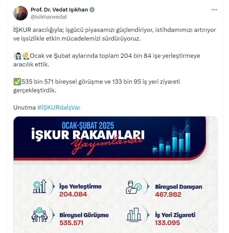Bakan Işıkhan, sosyal medya hesabından yaptığı açıklamada, “İŞKUR aracılığıyla; işgücü piyasamızı güçlendiriyor, istihdamımızı artırıyor ve işsizlikle etkin mücadelemizi sürdürüyoruz. Ocak ve şubat aylarında toplam 204 bin 84 işe yerleştirmeye aracılık ettik. 535 bin 571 bireysel görüşme ve 133 bin 95 iş yeri ziyareti gerçekleştirdik. Unutma İŞKUR’da iş var” dedi.