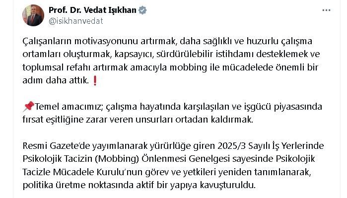 Bakan Işıkhan, sosyal medya hesabından yaptığı açıklamada, “Çalışanların motivasyonunu artırmak, daha sağlıklı ve huzurlu çalışma ortamları oluşturmak, kapsayıcı, sürdürülebilir istihdamı desteklemek ve toplumsal refahı artırmak amacıyla mobbing ile mücadelede önemli bir adım daha attık. Temel amacımız; çalışma hayatında karşılaşılan ve iş gücü piyasasında fırsat eşitliğine zarar veren unsurları ortadan kaldırmak. Resmi Gazete’de yayımlanarak yürürlüğe giren 2025/3 sayılı ‘İş Yerlerinde Psikolojik Tacizin (Mobbing) Önlenmesi Genelgesi’ sayesinde Psikolojik Tacizle Mücadele Kurulu’nun görev ve yetkileri yeniden tanımlanarak, politika üretme noktasında aktif bir yapıya kavuşturuldu. Kurul üyeleri revize edilerek ve Kurul’a katılım sağlayan kurum ve kuruluşların kapsamı genişletildi. Kurul’un yapısı, görev alanları ve kapsamı belirlendi. İşverenin sorumluluğunun kapsamı genişletildi. Gizlilik ilkesinin önemi vurgulandı ve gerçeğe aykırı iddiaların önlenmesi için düzenleme yapıldı. Eğitim ve bilgilendirme faaliyetlerini yürütecek kurum ve kuruluşların kapsamı genişletildi” ifadelerini kullandı.