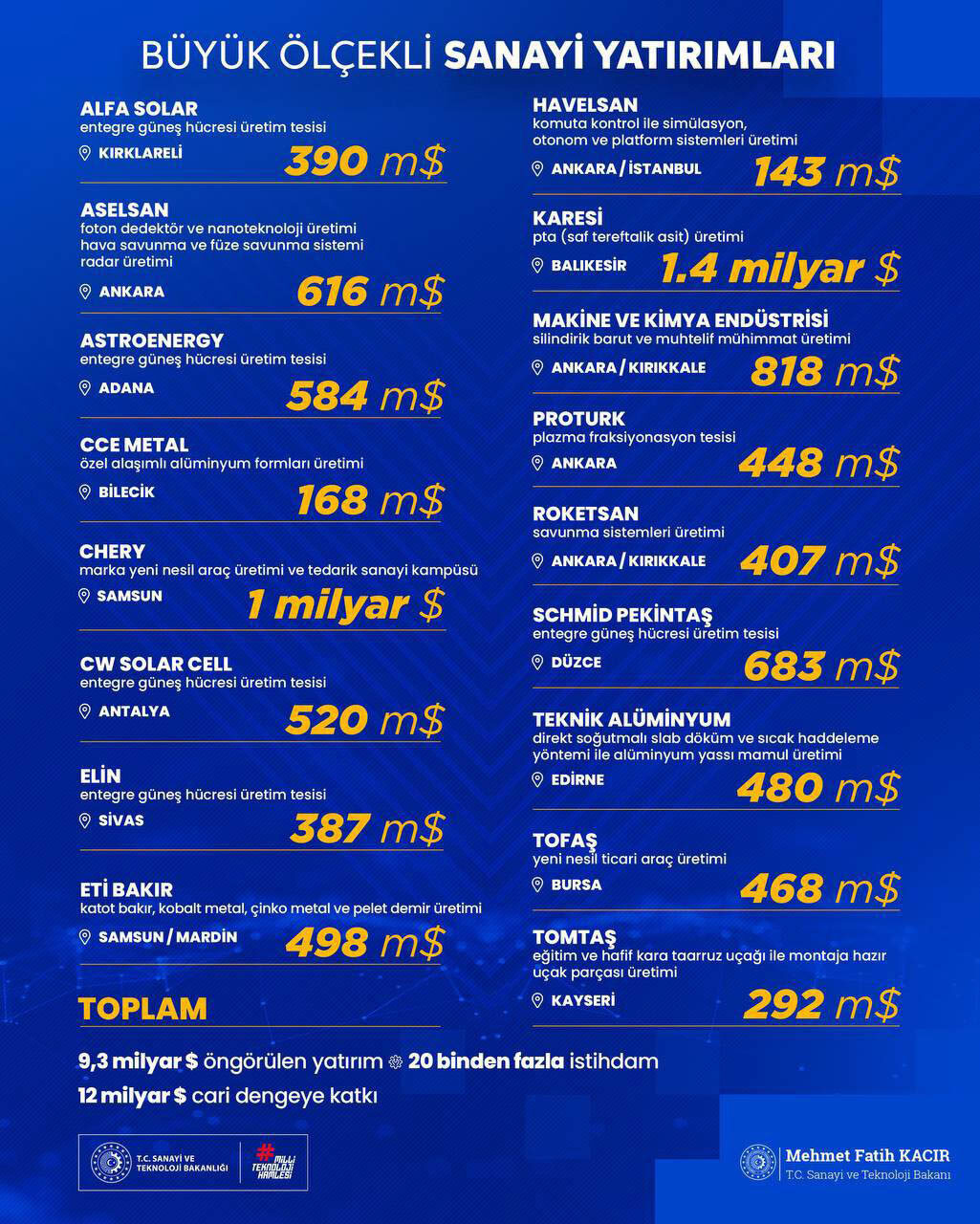 Bakan Kacır, 9,3 milyar dolarlık öngörülen yatırım tutarı ile 20 binden fazla istihdam ve yıllık cari dengeye 12 milyar dolarlık katkı sağlayacak olan büyük ölçekli sanayi yatırımlarının ayrıntılarını paylaştı. Cumhurbaşkanı Recep Tayyip Erdoğan tarafından açıklanan yatırımların ayrıntılarını sosyal medya hesabından paylaşan Bakan Kacır, “Edirne’den Samsun’a, Bilecik’ten Sivas’a 15 şehrimizde hayata geçecek büyük ölçekli sanayi yatırımları Türkiye’ye güç katacak. Güneş enerjisi teknolojilerinden yeni nesil araçlara, savunma sanayiinden sağlık teknolojilerine, ana metalden petrokimyaya Türkiye, yenilikçi teknolojilerde ve hammadde arz güvenliğinde yükselişini sürdürecek. 9,3 milyar dolar yatırımla, 20 binden fazla istihdam sağlanacak, cari dengemize yıllık 12 milyar dolar katkı sunulacak.” ifadelerini kullandı.