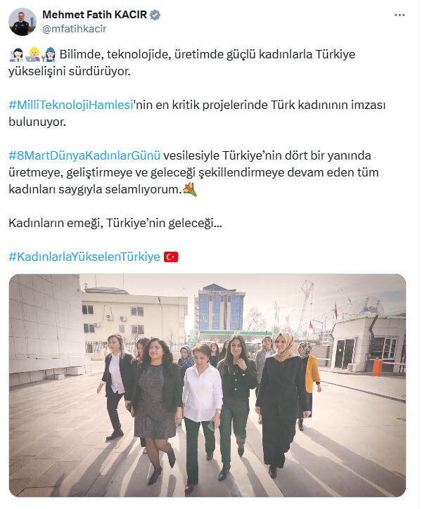 Bakan Kacır, sosyal medya hesabından paylaştığı mesajında, “Bilimde, teknolojide, üretimde güçlü kadınlarla Türkiye yükselişini sürdürüyor. Milli Teknoloji Hamlesi’nin en kritik projelerinde Türk kadınının imzası bulunuyor. 8 Mart Dünya Kadınlar Günü vesilesiyle Türkiye’nin dört bir yanında üretmeye, geliştirmeye ve geleceği şekillendirmeye devam eden tüm kadınları saygıyla selamlıyorum. Kadınların emeği, Türkiye’nin geleceği” dedi.