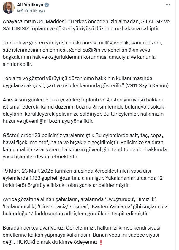 Yerlikaya, son günlerde bazı çevrelerin toplantı ve gösteri yürüyüşü hakkını istismar ederek, kamu düzenini bozma girişimlerinde bulunduğunu, sokak olaylarını körükleyerek polise saldırdığına, bu tür eylemlerin halkın huzur ve güvenliğini bozmaya yönelik olduğunu vurguladı. Yerlikaya, “Gösterilerde 123 polisimiz yaralanmıştır. Bu eylemlerde asit, taş, sopa, havai fişek, molotof, balta ve bıçak ele geçirilmiştir. Polisimize saldıran, kamu malına zarar veren, halkımızın güvenliğini tehdit edenler hakkında yasal işlemler devam etmektedir. 19 Mart-23 Mart 2025 tarihleri arasında gerçekleştirilen yasa dışı eylemlerde 1133 şüpheli gözaltına alınmıştır. Yakalananlar arasında 12 farklı terör örgütüyle iltisaklı olan şahıslar belirlenmiştir. Ayrıca gözaltına alınan şahısların, aralarında ‘Uyuşturucu’, ‘Hırsızlık’, ‘Dolandırıcılık’, ‘Cinsel taciz/istismar’, ‘Kasten yaralama’ gibi suçların da bulunduğu 17 farklı suçtan adli işlem gördükleri tespit edilmiştir. Buradan açıkça uyarıyoruz; Gençlerimizi, halkımızı kimse kendi siyasi emellerine kalkan yapmaya kalkmasın. Bunun vebalini sadece siyasi değil, hukuki olarak da kimse ödeyemez. Huzur ve güvenliğin tesisi için her zaman olduğu gibi görevimizin başındayız. Sokaklarımızın terörize edilmesine, milletimizin huzur ve güvenliğinin tehdit edilmesine kesinlikle müsamaha gösterilmeyecektir. Vatandaşlarımızı, bu tür provokasyonlara karşı dikkatli olmaya ve sağduyulu hareket etmeye davet ediyoruz” ifadelerini kullandı.