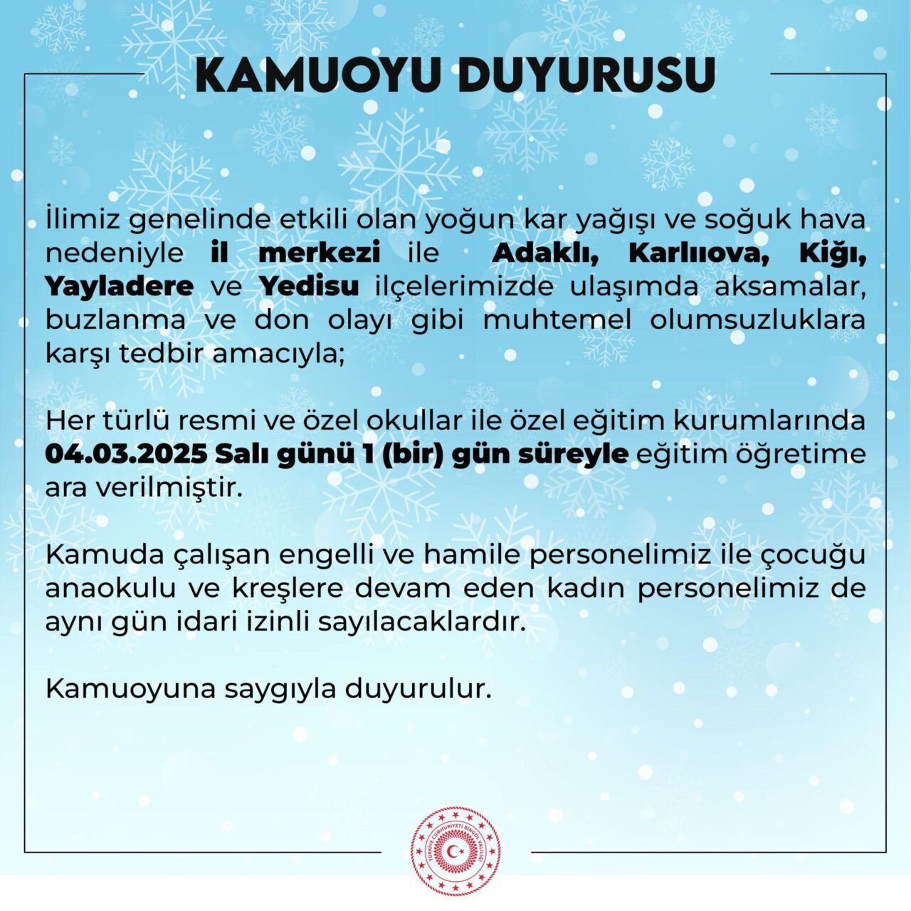 Valilikten yapılan açıklamada, kent merkezi ile Adaklı, Karlıova, Kiğı, Yayladere ve Yedisu ilçelerinde eğitim- öğretime 1 gün ara verildiği belirtildi. Açıklamada, aynı gün kamuda çalışan engelli ve hamile personeller ile çocuğu anaokulu ve kreşlere devam eden kadın personellerin de idari izinli sayılacağı belirtilerek, “İlimiz genelinde etkili olan yoğun kar yağışı ve soğuk hava nedeniyle il merkezi ile Adaklı, Karlıova, Kiğı, Yayladere ve Yedisu ilçelerimizde ulaşımda aksamalar, buzlanma ve don olayları gibi muhtemel olumsuzluklara karşı tedbir amacıyla, her türlü resmi ve özel okullar ile özel eğitim kurumlarında 04 Mart 2025 Salı günü 1 gün süreyle eğitim öğretime ara verilmiştir. Kamuda çalışan engelli ve hamile personelimiz ile çocuğu anaokulu ve kreşlere devam eden kadın personelimiz de aynı gün idari izinli sayılacaktır” denildi.