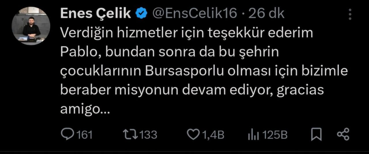 Bursaspor Başkanı Enes Çelik ise sosyal medya hesabından yaptığı açıklamada, “Verdiğin hizmetler için teşekkür ederim. Pablo, bundan sonra da bu şehrin çocuklarının Bursasporlu olması için bizimle beraber misyonun devam ediyor, gracias amigo…” ifadelerine yer verdi.