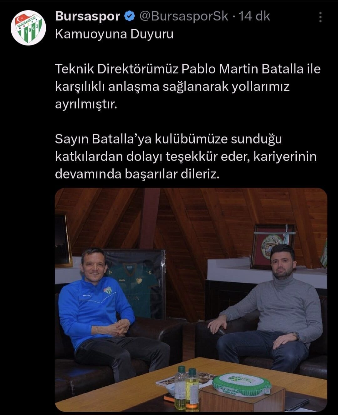 3. Lig ekiplerinden Bursaspor, teknik direktör Pablo Martin Batalla ile yollarını ayırdıklarını açıkladı. Bursaspor’un resmi sosyal medya hesaplarından yapılan açıklamada, “Teknik direktörümüz Pablo Martin Batalla ile karşılıklı anlaşma sağlanarak yollarımızı ayrılmıştır. Sayın Batalla’ya kulübümüze sunduğu katkılardan dolayı teşekkür eder, kariyerinin devamında başarılar dileriz” ifadeleri kullanıldı.