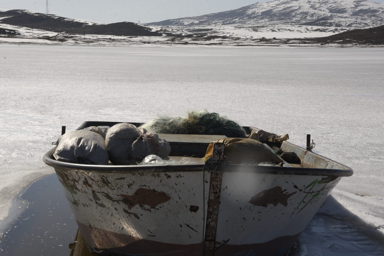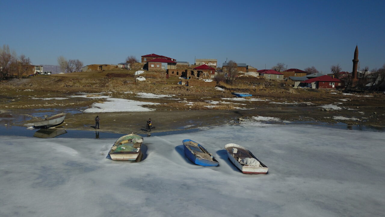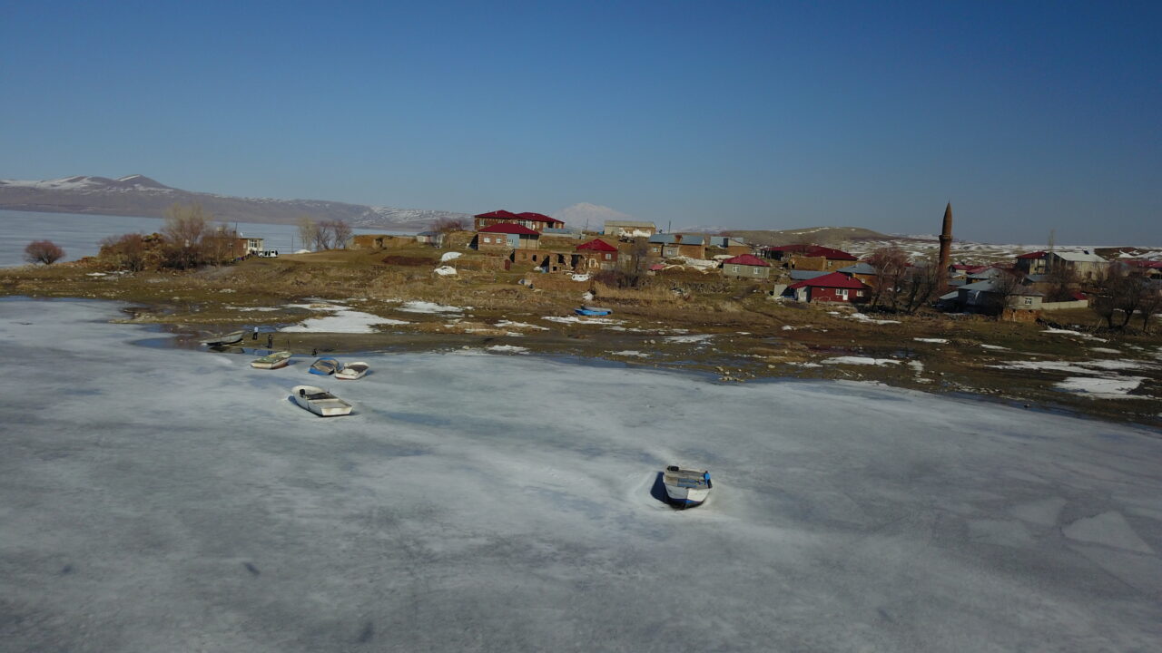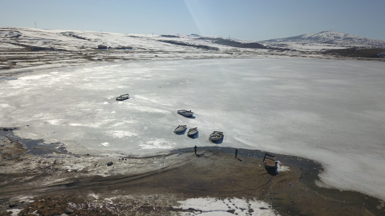 Özcan ÇİRİŞ/BİTLİS, – BİTLİS’in Ahlat ilçesinde donan Nazik Gölü, havaların ısınmaya başlaması ile birlikte erimeye başladı. Buz kütleleri arasındaki balıkçı tekneleri ve buzları erimeye başlayan göl, havadan görüntülendi.