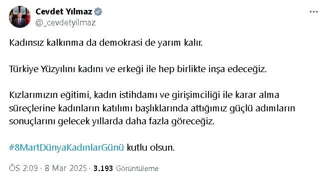 Cumhurbaşkanı Yardımcısı Cevdet Yılmaz, 8 Mart Dünya Kadınlar Günü dolayısıyla sosyal medya hesabından paylaştığı mesajında, “Kadınsız kalkınma da demokrasi de yarım kalır. ‘Türkiye Yüzyılı’nı kadını ve erkeği ile hep birlikte inşa edeceğiz. Kızlarımızın eğitimi, kadın istihdamı ve girişimciliği ile karar alma süreçlerine kadınların katılımı başlıklarında attığımız güçlü adımların sonuçlarını gelecek yıllarda daha fazla göreceğiz. 8 Mart Dünya Kadınlar Günü kutlu olsun” dedi.