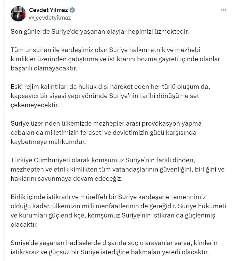 Yılmaz, “Türkiye Cumhuriyeti olarak komşumuz Suriye’nin farklı dinden, mezhepten ve etnik kimlikten tüm vatandaşlarının güvenliğini, birliğini ve haklarını savunmaya devam edeceğiz. Birlik içinde istikrarlı ve müreffeh bir Suriye kardeşane temennimiz olduğu kadar, ülkemizin milli menfaatlerinin de gereğidir. Suriye hükümeti ve kurumları güçlendikçe, komşumuz Suriye’nin istikrarı da güçlenmiş olacaktır. Suriye’de yaşanan hadiselerde dışarıda suçlu arayanlar varsa, kimlerin istikrarsız ve güçsüz bir Suriye istediğine bakmaları yeterli olacaktır” değerlendirmesinde bulundu.