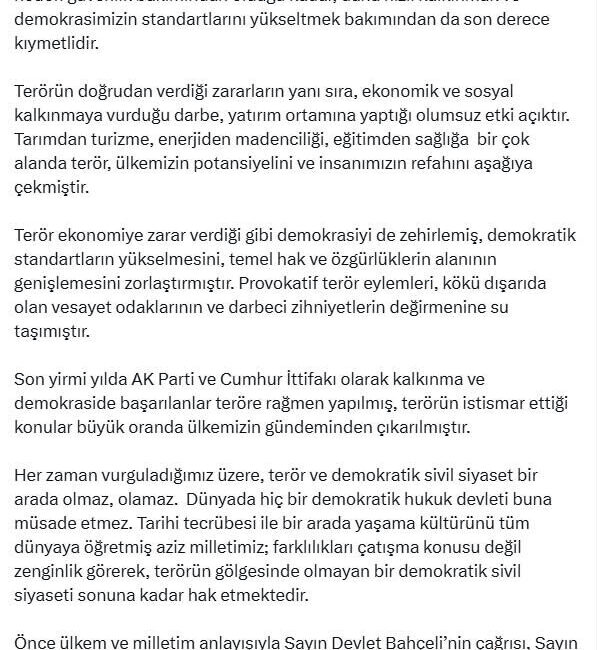 Yılmaz, “Önce ülkem ve milletim’ anlayışıyla Sayın Devlet Bahçeli’nin çağrısı, Sayın Cumhurbaşkanımız Recep Tayyip Erdoğan’ın ortaya koyduğu Türkiye Yüzyılı vizyonu çerçevesinde liderliği ve kararlı duruşu, birçok farklı siyasi parti ve çevrenin desteği ile Terörsüz Türkiye hedefi ülkemizin gündemi haline gelmiştir. Terör örgütünün hiçbir pazarlık söz konusu olmadan kendisini feshetmesi, güvenlik alanında olduğu kadar, kalkınma ve demokrasi bakımından da yeni bir ortam ve dönem anlamı taşımaktadır. Son olarak Terörsüz Türkiye hedefine yönelik yeni bir aşamaya geçilmiş, kurucusu tarafından terör örgütüne feshetme çağrısı yapılmıştır. Bu yeni safhayı ve bunun sahadaki somut yansımalarını ilgili kurumlarımızla birlikte dikkatle takip edeceğiz. Temenni ederiz ki bu fırsat değerlendirilsin, bu çaba hızlı bir şekilde başarıyla sonuçlansın ve bölgemiz üzerinde emperyal heveslerle plan yapanların tuzakları en kısa yoldan bozulsun. 85 milyon insanımızın bin yıllık kardeşlik, inanç ve kader ortaklığı zemininde; Sayın Cumhurbaşkanımızın dirayetli liderliğinde Türkiye Yüzyılı herhalükarda birliğin, kardeşliğin ve huzurun yüzyılı olacaktır. Ay yıldızlı şanlı bayrağımızın gölgesinde, demokratik, güçlü ve müreffeh Türkiye Cumhuriyeti Devleti, iç cephesini tahkim ederek, bölgesinde ve küresel düzeyde mazlumların umudu, adaletin gür sesi olarak tarihi yürüyüşünü sürdürecektir” ifadelerini kullandı.