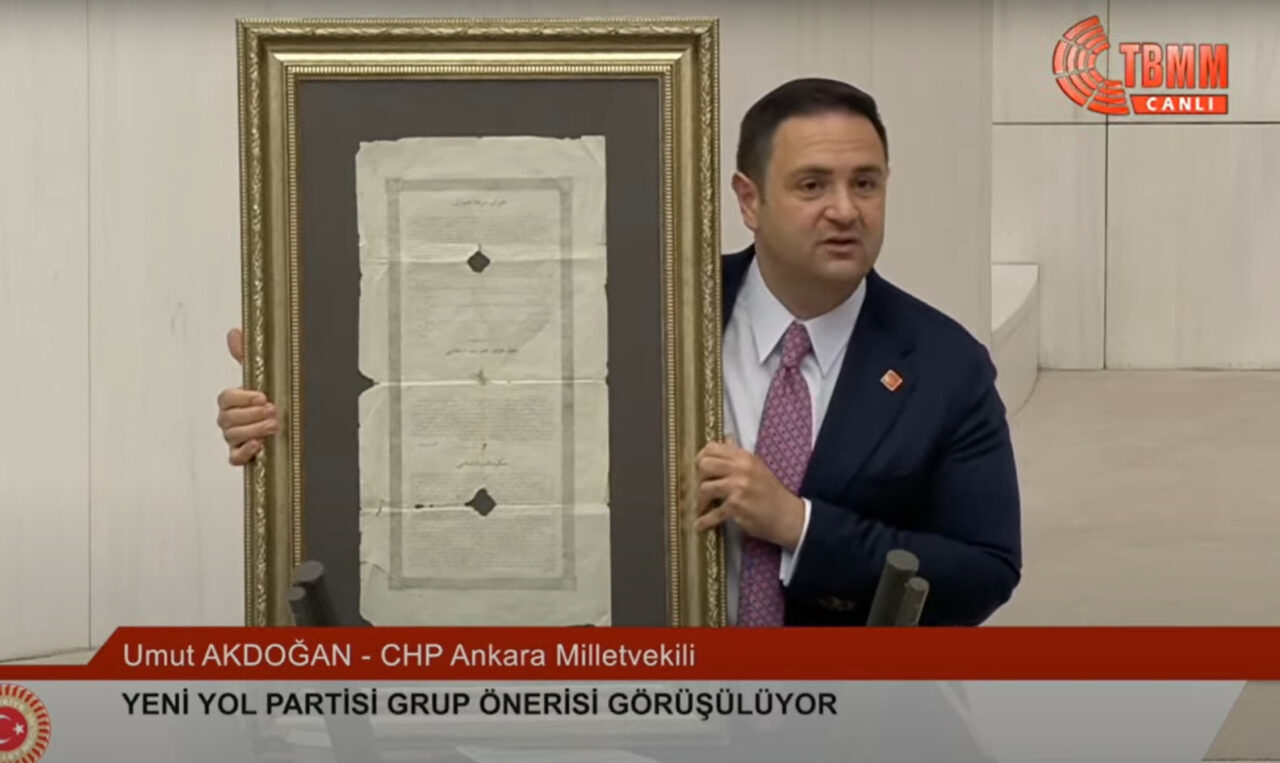 Genel Kurul’da yaşanan tartışmaların ardından siyasi partilerin grup önerileri görüşülmeye başlandı. Yeni Yol Grubunun yerel yönetimler ile ilgili araştırma önergesi üzerine kürsüde söz alan CHP Ankara Milletvekili Umut Akdoğan, 11 Nisan 1920 tarihli Mustafa Kemal Atatürk ve silah arkadaşları için çıkarılan idam fermanını gösterdi. Akdoğan, “Padişah Vahdettin’i İngilizlere sığınmasıyla, Damat Ferid’i Fransızlara sığınmasıyla bilmektedir ama bütün dünya Gazi Mustafa Kemal Atatürk’ün kahramanlığını ve bu ülkeyi kurmuş olduğunu bilmektedir. Menderes idam edilmiştir, Türkeş sürgün edilmiştir, Erbakan’a yasak getirilmiştir, İsmet Paşa illere sokulmamıştır; Ecevit, ‘Dudaklarım var olduğu sürece konuşacağım’ demiştir, Ecevit’e karşı Milli Güvenlik Kurulu Genel Sekreterliği, ‘Bay Ecevit ve Bay Demirel bundan sonra partilerinin başına geçemez’ demiştir. Bu kararı verenlerin hiçbirisi tarihte yoktur ancak bu isimlerin her birinin seveni milyonlar hayattadır. Selahattin Demirtaş 9 senede seçmenlerinin gönlünden silinmemiştir, ‘Muhtar bile olamaz’ denen Erdoğan, bu ülkede iktidar olmuştur. Şimdi, bu örneklerden yola çıkarak diyorum ki; Silivri Cezaevi bundan sonra sadece bir cezaevi değil, müstakbel cumhurbaşkanının çalışma ofisidir. İdam fermanı burada durmaktadır, Yassıada bir utanç abidesi olarak durmaktadır, Zincirbozan bir direnç abidesi olarak durmaktadır, Hamzakoy bir uzlaşı abidesi olarak durmaktadır; Pınarhisar, Diyarbakır, Metris, Mamak cezaevleri bir tarih dersi gibi ortada durmaktadır. Gidin bakın, ibret alın ve geleceği görün” değerlendirmesinde bulundu.