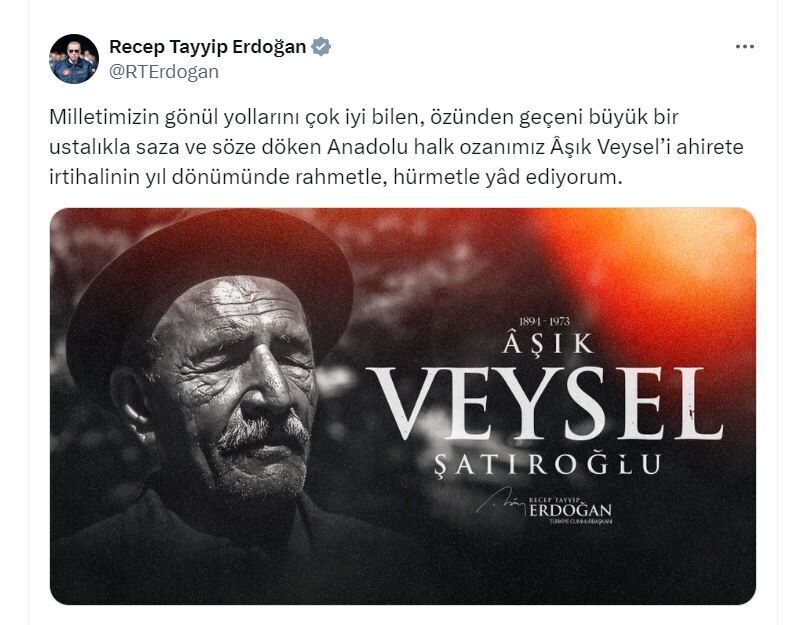 ANKARA, – CUMHURBAŞKANI Recep Tayyip Erdoğan, ölümünün 52’nci yılında, ünlü halk ozanı Aşık Veysel Şatıroğlu’nu sosyal medya paylaşımıyla andı.