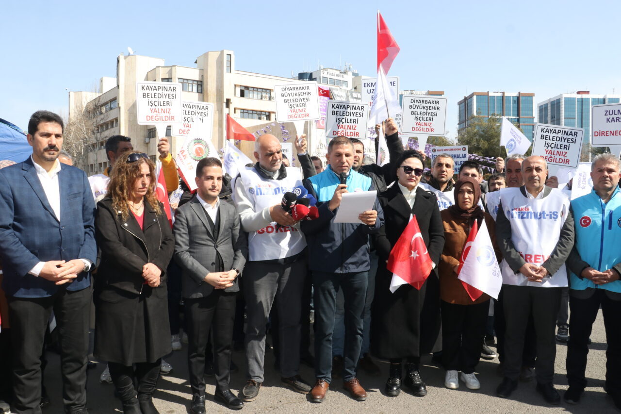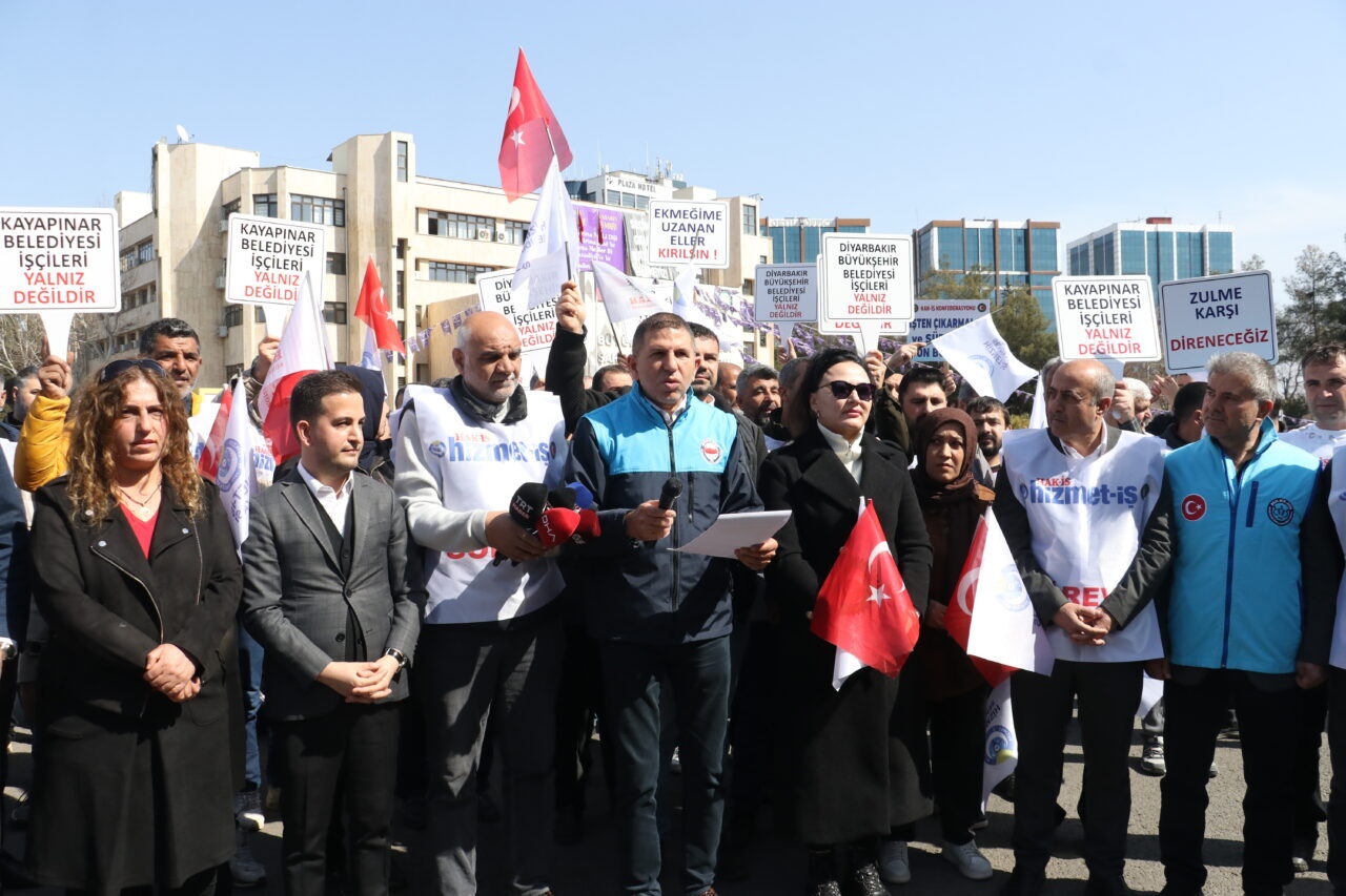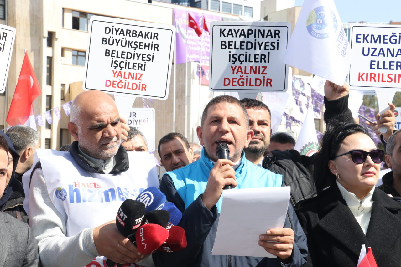 31 Mart 2024 seçimlerinden sonra DEM Parti’nin kazandığı belediyelerde çeşitli gerekçelerle işten çıkarılan işçiler, Büyükşehir Belediyesi binası önünde eylem başlattı. Kurdukları çadırda haklarını arayan işçiler, 251 gündür eylemlerini sürdürüyor. Çadırı ziyaret eden Eğitim Bir Sen 1 Nolu Şube Başkanı Ramazan Tekdemir, “Diyarbakır Büyükşehir Belediyesi önünde eylemimizin 251’inci gününde emek ve ekmek mücadelesi verdiğimiz çadırdan, zorbalara ve despot uygulamalarına karşı sesimizi yükseltmeye devam ediyoruz. DEM’li belediye yönetimleri tarafından hiçbir gerekçe gösterilmeden işten çıkarılan, iş güvenceleri ellerinden alınan işçi kardeşlerimizin sayısı 845’e, sözleşmeli memurların sayısı ise 270’e ulaştı. DEM Parti’li belediyelerde yaşanan işçi ve emekçi kıyımı hukuki ve insani tüm sınırları aşmış durumdadır” dedi.