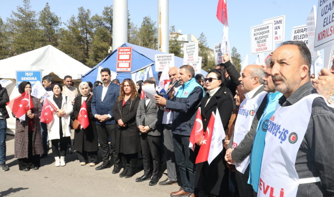 31 Mart 2024 seçimlerinden sonra DEM Parti’nin kazandığı belediyelerde çeşitli gerekçelerle işten çıkarılan işçiler, Büyükşehir Belediyesi binası önünde eylem başlattı. Kurdukları çadırda haklarını arayan işçiler, 251 gündür eylemlerini sürdürüyor. Çadırı ziyaret eden Eğitim Bir Sen 1 Nolu Şube Başkanı Ramazan Tekdemir, “Diyarbakır Büyükşehir Belediyesi önünde eylemimizin 251’inci gününde emek ve ekmek mücadelesi verdiğimiz çadırdan, zorbalara ve despot uygulamalarına karşı sesimizi yükseltmeye devam ediyoruz. DEM’li belediye yönetimleri tarafından hiçbir gerekçe gösterilmeden işten çıkarılan, iş güvenceleri ellerinden alınan işçi kardeşlerimizin sayısı 845’e, sözleşmeli memurların sayısı ise 270’e ulaştı. DEM Parti’li belediyelerde yaşanan işçi ve emekçi kıyımı hukuki ve insani tüm sınırları aşmış durumdadır” dedi.