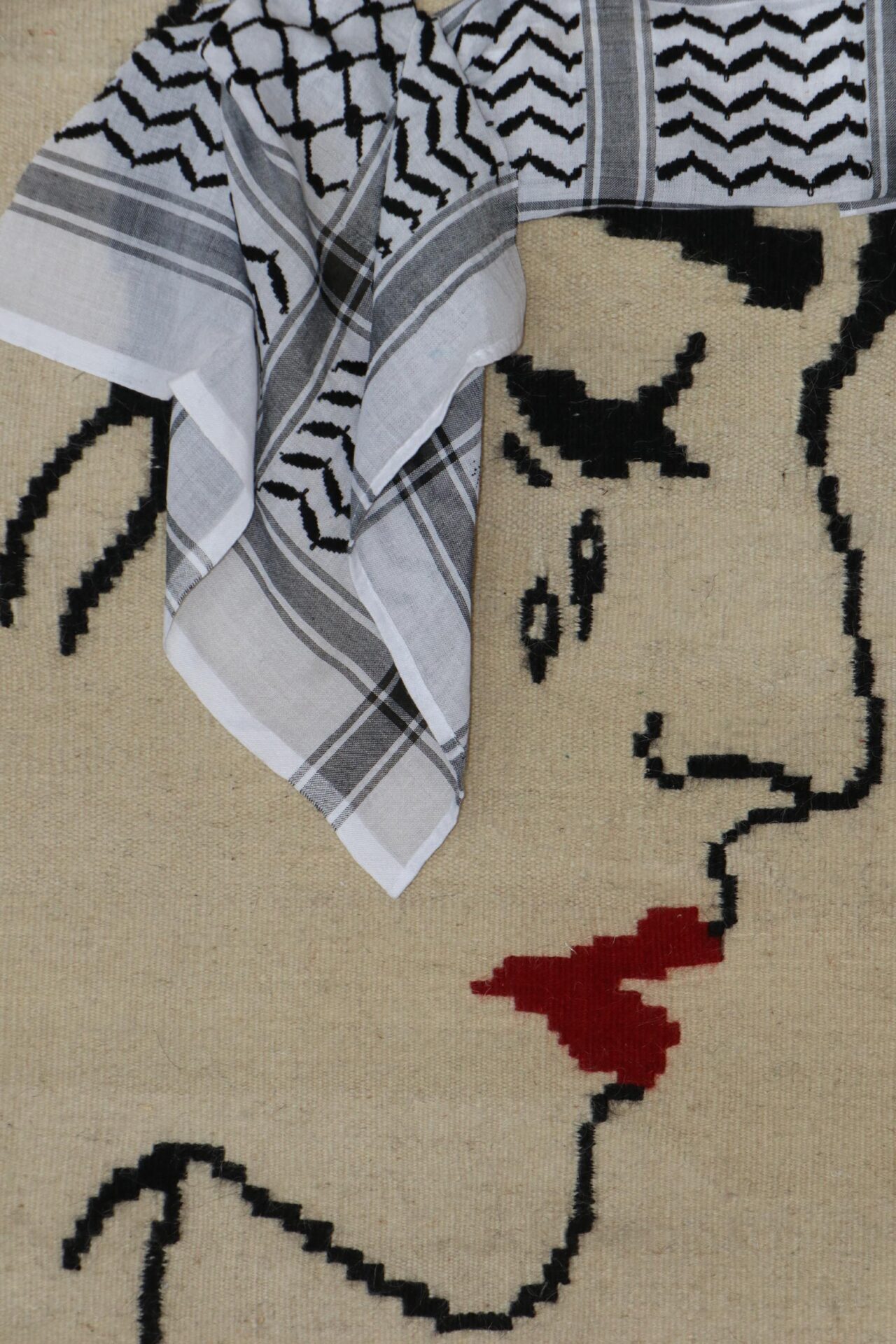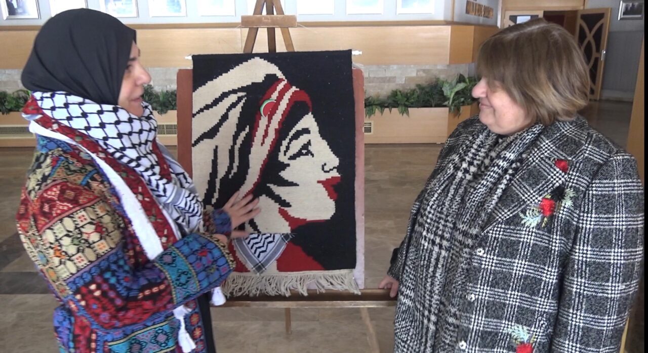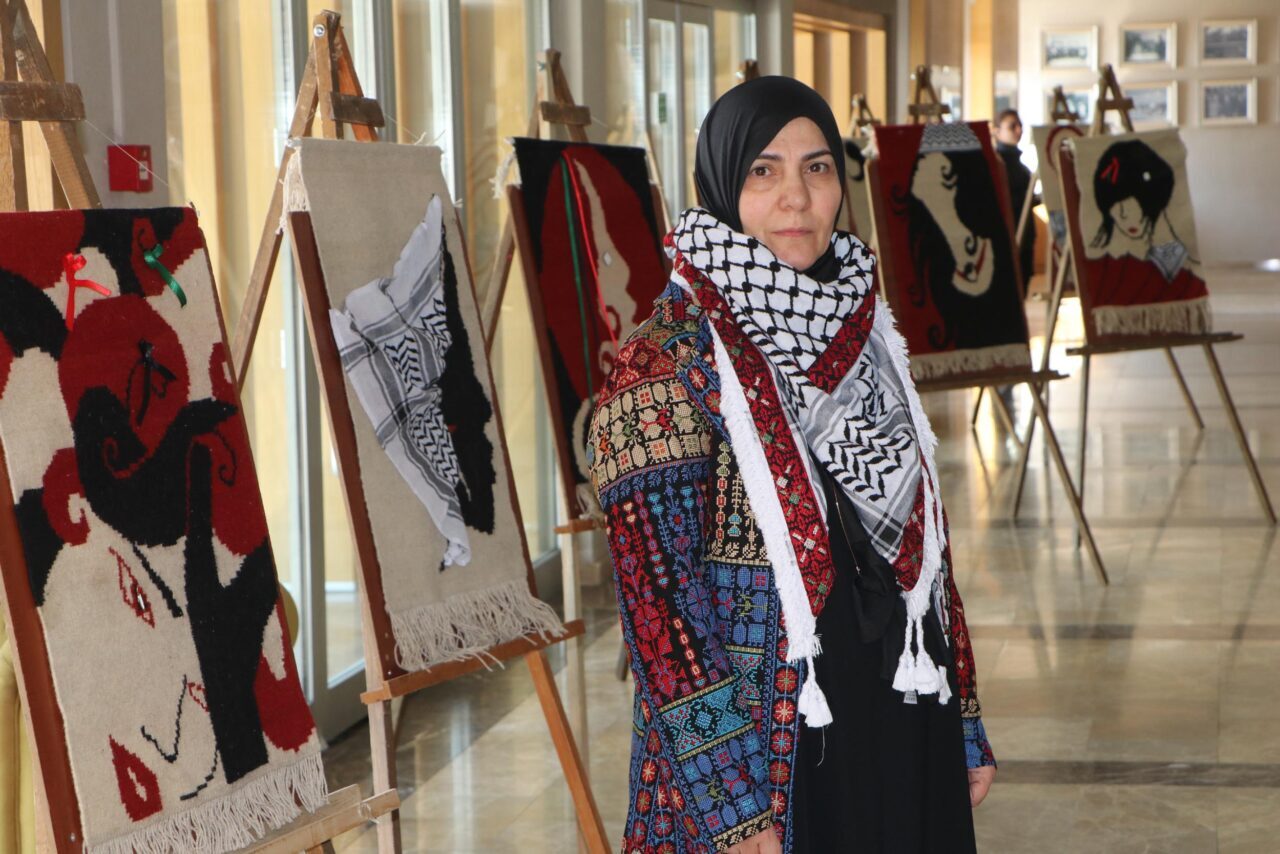 Prof. Dr. Eroğlu, “Eserlerimde Filistinli kadınların sesi olan dünya ülkelerinin kadınlarına da yer verdim. Yaptığım dokumalarda işlediğim çeşitli ülkelerin kadınlarına kefiye giydirerek bir farkındalık oluşturmaya çalıştım. Bu sergiyi Filistinli kadınların sesi olmak arzusuyla hazırladım” diye konuştu.