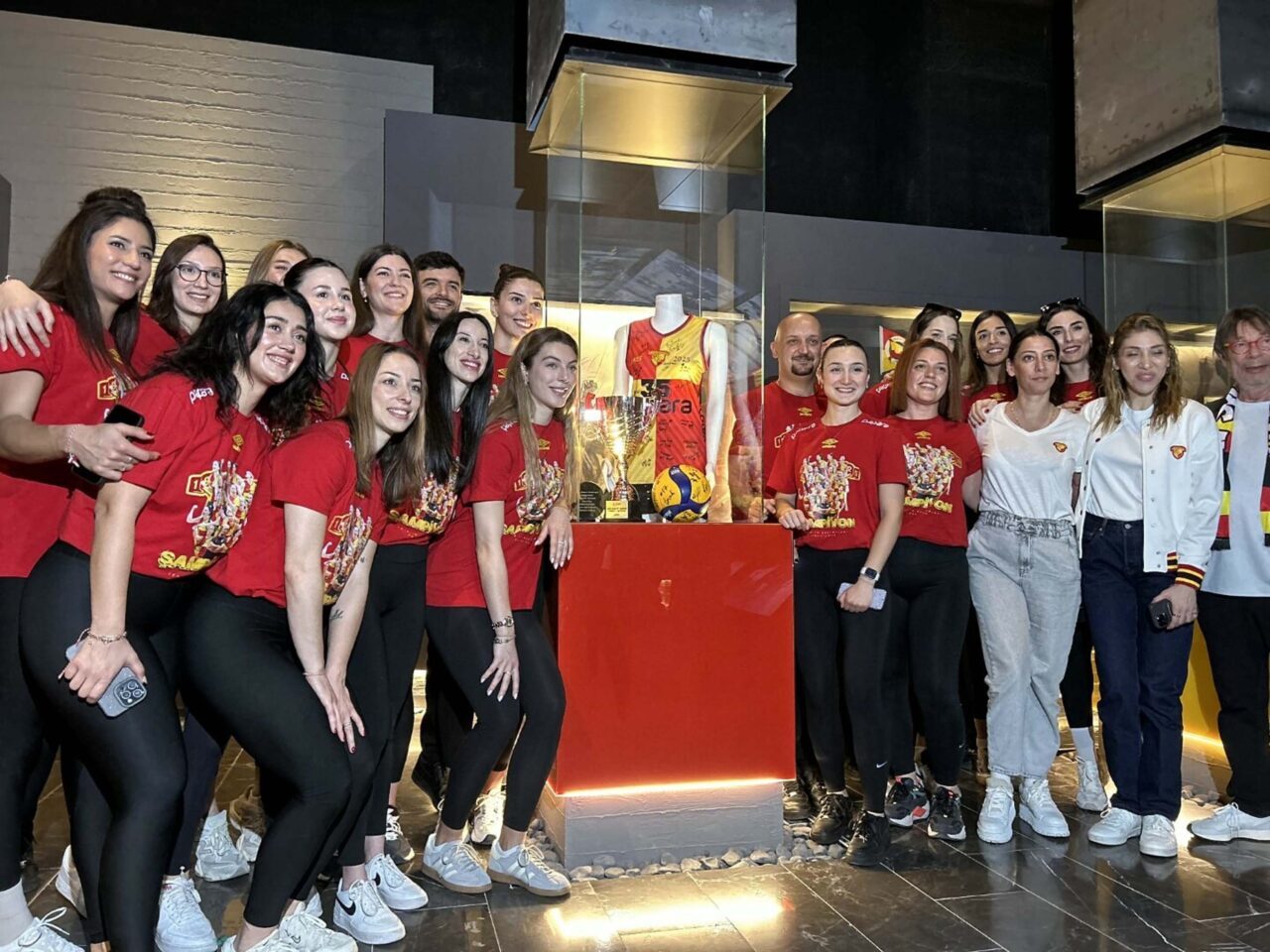 Onur ATIŞ / İZMİR, – SULTANLAR Ligi’ne yükselmeyi başaran Papara Göztepe Kadın Voleybol Takımı’nın şampiyonluk kupası Gürsel Aksel Stadı’ndaki yerini aldı. KFC Kadınlar 1’inci Ligi’nde geçirdiği başarılı sezonun ardından final grubunda da rakiplerini geride bırakıp Alanya’da Sultanlar Ligi’ne yükselen sarı-kırmızılılar, kupayla birlikte stattaki müzeye geldi. Törenle müzeye koyulan kupa, sporseverlerden büyük ilgi gördü.