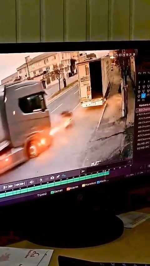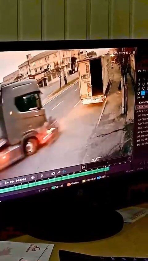 Motosiklet sürücüsü Onur Sönmemiş’in hayatını kaybettiği kaza, olay yerindeki bir iş yerinin güvenlik kamerasına yansıdı. Görüntülerde, garaja girmek için dönüş yapan TIR’ın motosiklet sürücüsüne çarptığı ve Sönmemiş’in savrularak park halindeki başka bir TIR’ın dorsesine çarptığını görülüyor.
