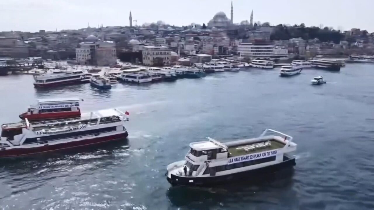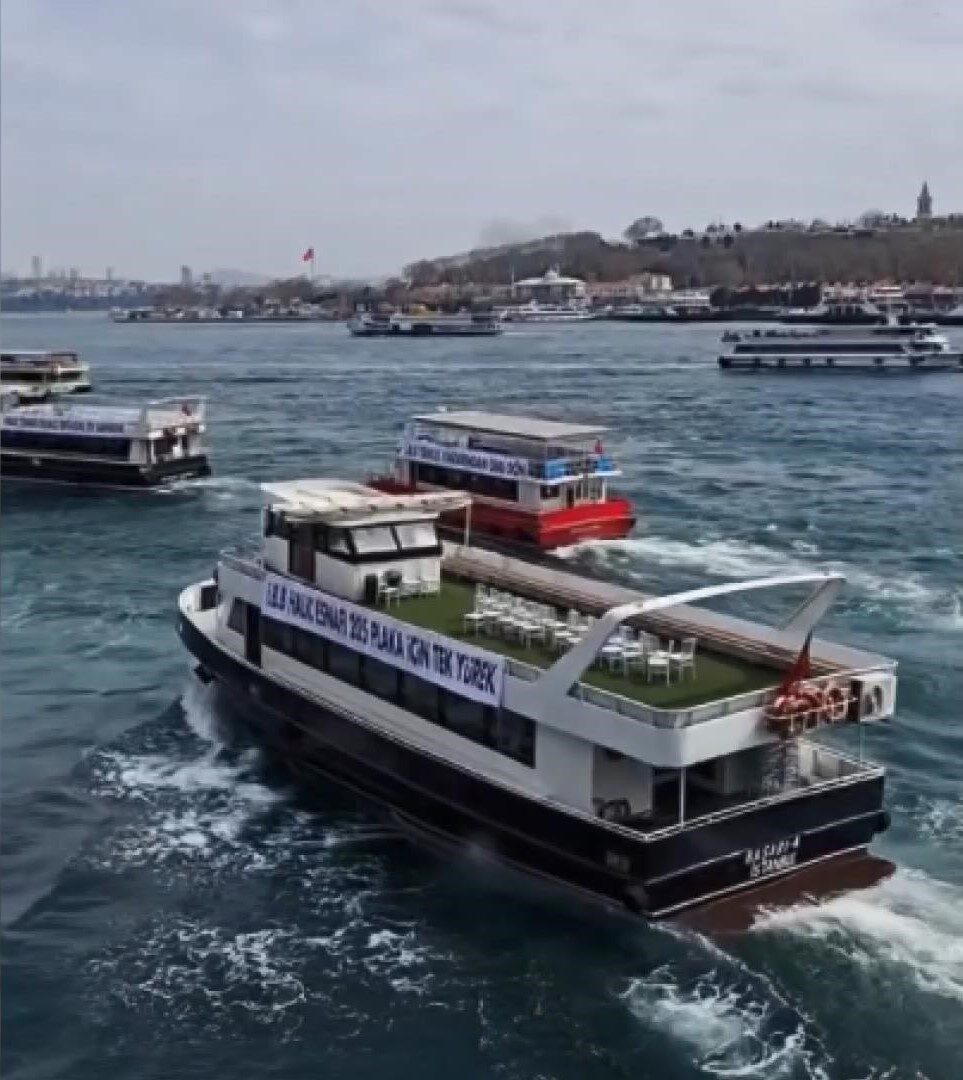 Haliç’te tekne sahiplerinin, UKOME toplantısında görüşülmesini beklediği, 203 adet tekne plakasının iptal edilmesiyle ilgili madde protesto edildi. Hazırladıkları afişleri teknelerine asan esnaf Haliç’e açıldı. 50 tekne sahibi korna çalarak tepkisini dile getirdi. İstanbul Boğazı’na açılan tekne sahiplerinin protestosu dronla havadan da görüntülendi.