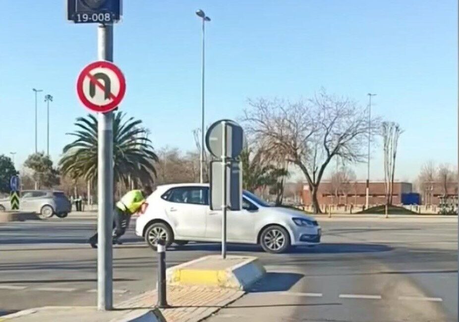 Olay, saat 09.00 sıralarında Mimar Sinan ışıklar mevkiinde meydana geldi. Edinilen bilgiye göre sahilyolunda bir otomobil hasarlı kazaya karıştı. Olay yerine gelen trafik polisi A.B. kaza sonrası arızalanan aracı, trafiğe engel olmaması için park görevlisiyle iterek yol kenarına aldı. O anlar cep telefonu kamerasına yansıdı.