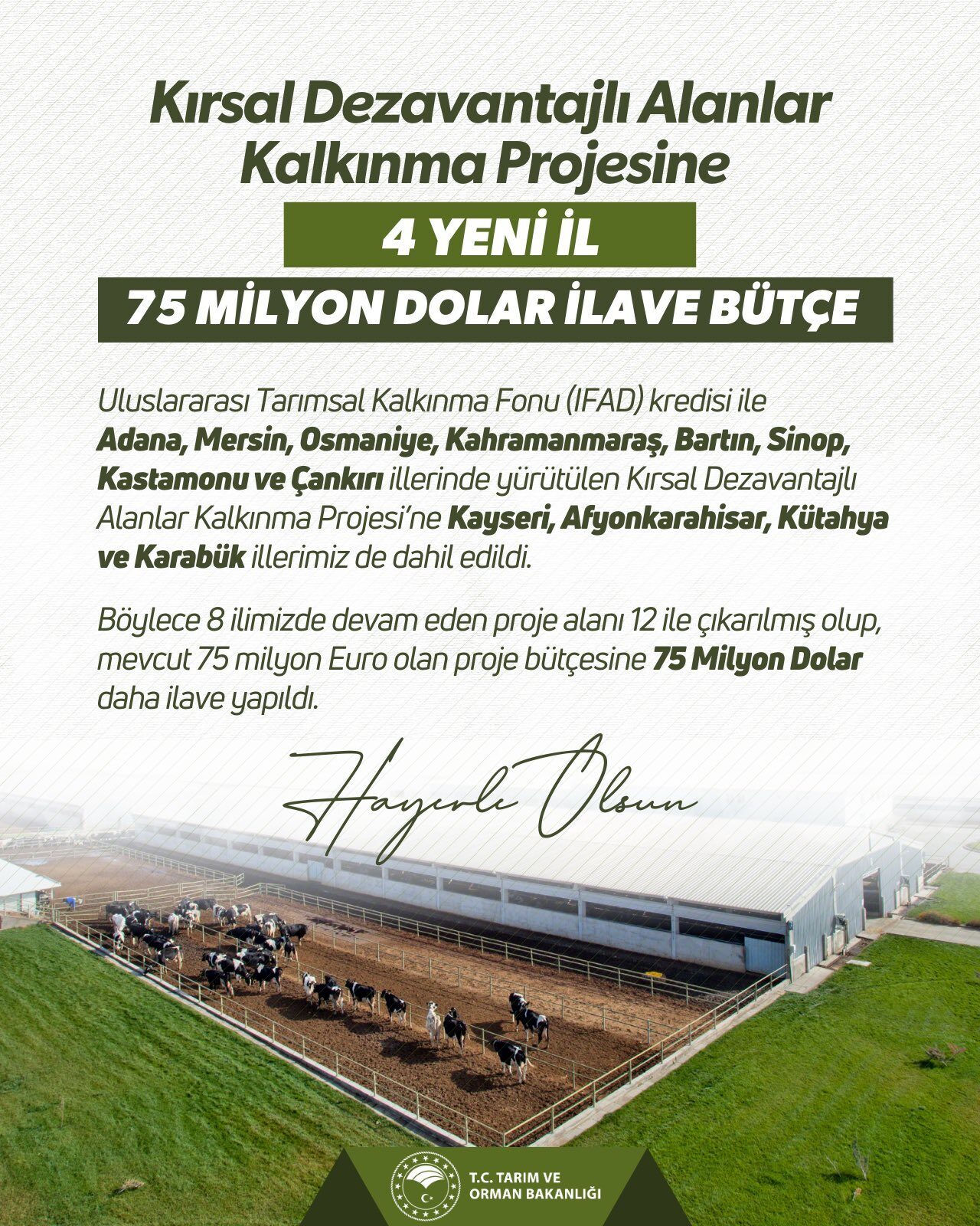 Tarım ve Orman Bakanlığı’nın sosyal medya hesabından yapılan paylaşımda, “Uluslararası Tarımsal Kalkınma Fonu (IFAD) kredisi ile Adana, Mersin, Osmaniye, Kahramanmaraş, Bartın, Sinop, Kastamonu ve Çankırı illerinde yürütülen Kırsal Dezavantajlı Alanlar Kalkınma Projesi’ne Kayseri, Afyonkarahisar, Kütahya ve Karabük illerimiz de dahil edildi. Böylece 8 ilimizde devam eden proje alanı 12 ile çıkarılmış olup, mevcut 75 milyon Euro olan proje bütçesine 75 Milyon Dolar daha ilave yapıldı” ifadeleri kullanıldı.