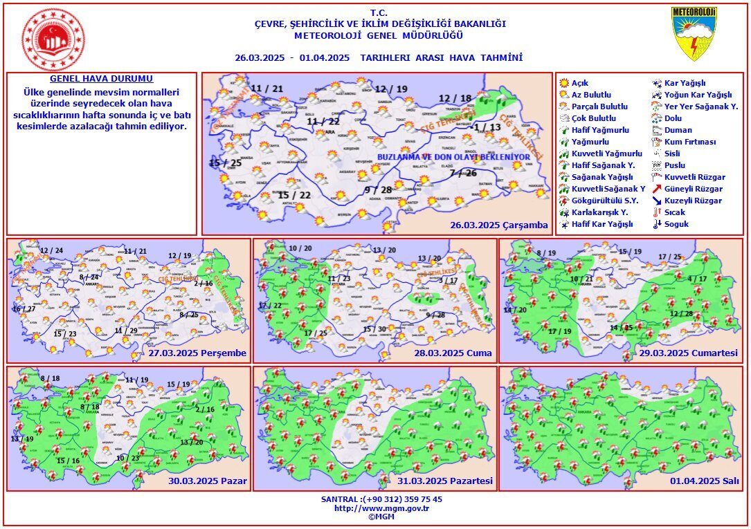 Meteoroloji Genel Müdürlüğü Hava Tahmin Uzmanı Abdullah Macit, cuma günü ve hafta sonunda yurt genelinde yağış beklediklerini söyleyerek, “Cuma günü özellikle öğle saatlerinden sonra yurdun batı kesimleri, yeni bir yağışlı havanın etkisine giriyor. Marmara, Ege ve Akdeniz’e başlayacak yağışların hafta sonu yurt genelinde sağanak ve gök gürültülü sağanak şeklinde görülmesini bekliyoruz. Hava sıcaklığı cuma gününe kadar mevsim normallerinin üzerinde seyredecek, hafta sonunda iç ve batı kesimlerde yağışla birlikte azalarak mevsim normallerine düşmesini, doğu kesimlerde ise mevsim normallerinin üzerinde seyretmesini bekliyoruz” dedi. Macit, bayramın 2 ve 3’üncü günleri olan pazartesi ve salı günlerinde de yurdun büyük bölümünde yağışların etkili olacağını söyledi.
