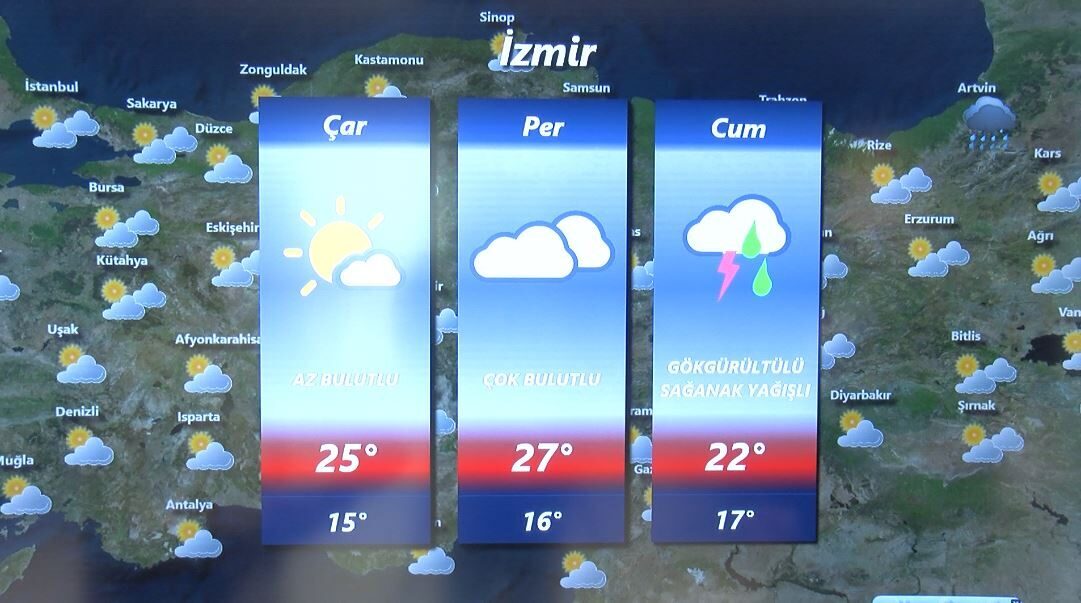 3 büyük ildeki hava durumuna değinen Macit, “İstanbul’da çarşamba ve perşembe yağış beklemiyoruz. Cuma günden itibaren İstanbul’da sağanak ve gök gürültülü sağanak yağış beklentimiz var. Hava sıcaklığı 24 dereceye kadar çıkıyor; ama hafta sonunda azalmasını bekliyoruz. İzmir’de cuma günü sağanak ve gök gürültülü sağanak yağışın etkili olmasını bekliyoruz. İzmir’de çarşamba, perşembe 27 dereceye kadar çıkıyor. Hafta sonunda 22 derece civarında olacak. Ankara’da yağış beklentimiz yok, cuma dahil olmak üzere. Hafta sonunda Ankara’da da hafif yağmur geçişleri bekliyoruz. Hava sıcaklığı 25-26 derecelerden 21-22 dereceye kadar azalacak. Dolayısıyla hafta sonunda hava sıcaklıklarının iç ve batı kesimlerde mevsim normalleri civarına düşeceğini tahmin ediyoruz” dedi.