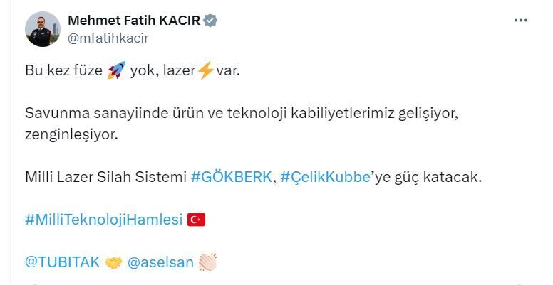 Sanayi ve Teknoloji Bakanı Mehmet Fatih Kacır, sosyal medya hesabından yaptığı açıklamada, “Bu kez füze yok, lazer var. Savunma sanayinde ürün ve teknoloji kabiliyetlerimiz gelişiyor, zenginleşiyor. Milli lazer silah sistemi GÖKBERK, Çelik Kubbe’ye güç katacak” dedi.