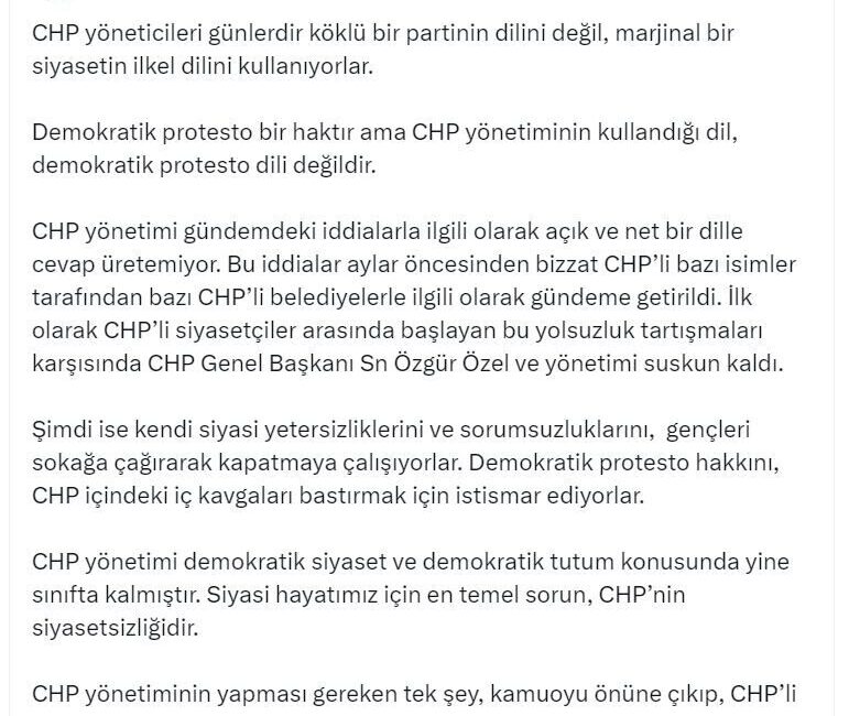 İlk olarak CHP’li siyasetçiler arasında başlayan bu yolsuzluk tartışmaları karşısında CHP Genel Başkanı Özgür Özel ve yönetiminin suskun kaldığını kaydeden Çelik, “Şimdi ise kendi siyasi yetersizliklerini ve sorumsuzluklarını, gençleri sokağa çağırarak kapatmaya çalışıyorlar. Demokratik protesto hakkını, CHP içindeki iç kavgaları bastırmak için istismar ediyorlar. CHP yönetimi demokratik siyaset ve demokratik tutum konusunda yine sınıfta kalmıştır. Siyasi hayatımız için en temel sorun, CHP’nin siyasetsizliğidir. CHP yönetiminin yapması gereken tek şey, kamuoyu önüne çıkıp, CHP’li bazı siyasetçilerin CHP’li bazı belediyeler hakkında dile getirdiği iddialara cevap vermektir” ifadelerini kullandı.