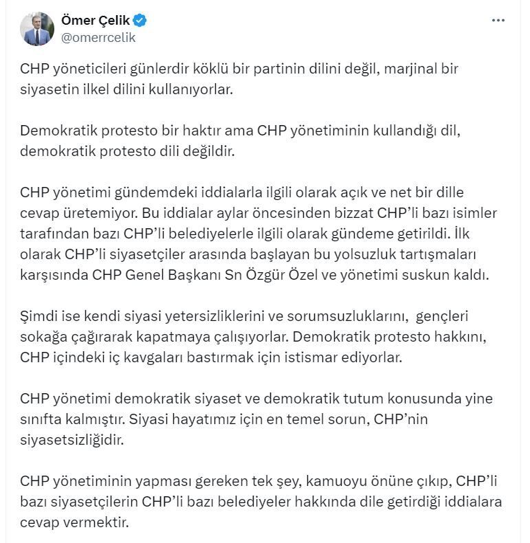 AK Parti Sözcüsü Ömer Çelik, İstanbul Büyükşehir Belediyesi’ne yönelik ‘yolsuzluk’ soruşturmasının ardından başlayan protestolarla ilgili sosyal medya hesabından açıklama yaptı. Çelik, “CHP yöneticileri günlerdir köklü bir partinin dilini değil, marjinal bir siyasetin ilkel dilini kullanıyorlar. Demokratik protesto bir haktır ama CHP yönetiminin kullandığı dil, demokratik protesto dili değildir. CHP yönetimi gündemdeki iddialarla ilgili olarak açık ve net bir dille cevap üretemiyor. Bu iddialar aylar öncesinden bizzat CHP’li bazı isimler tarafından bazı CHP’li belediyelerle ilgili olarak gündeme getirildi” dedi.