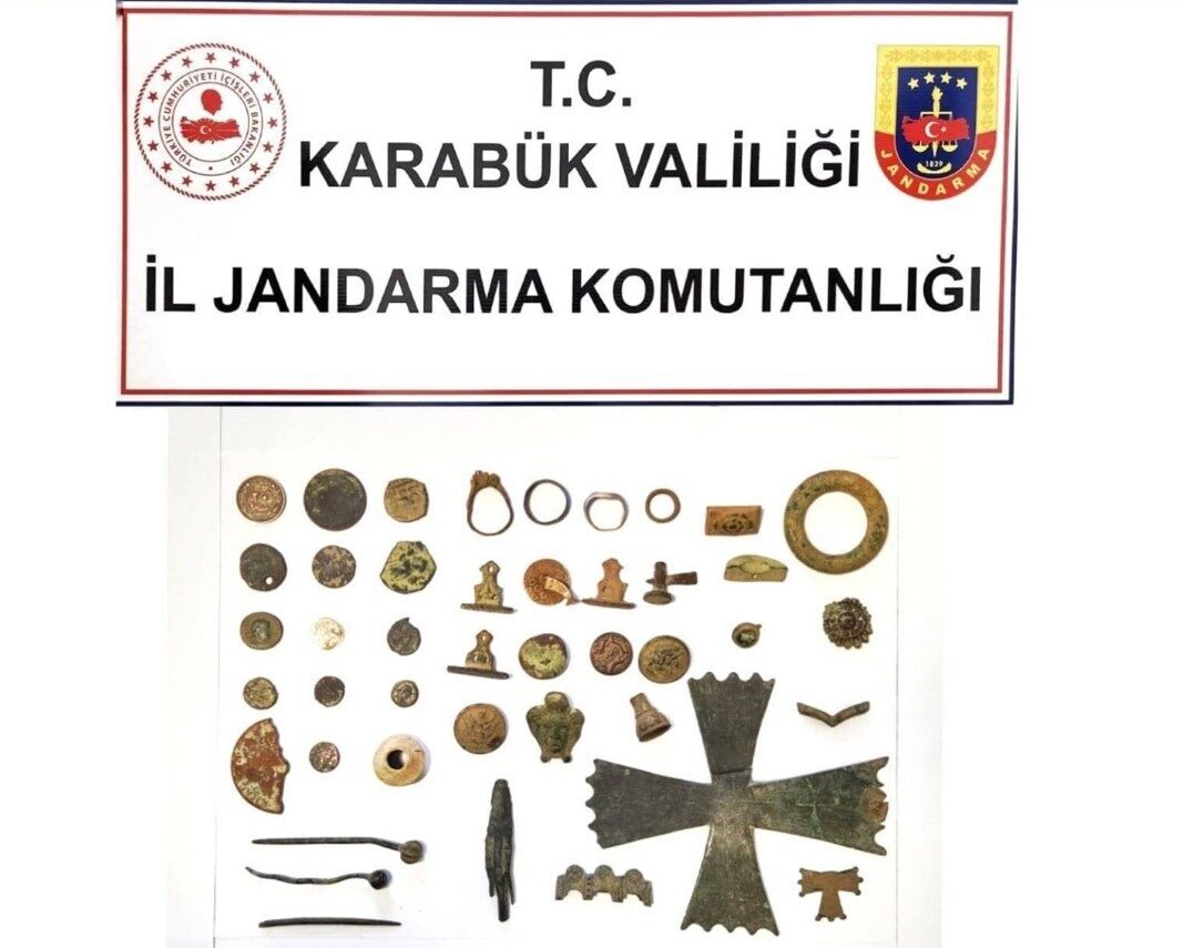 Karabük İl Jandarma Komutanlığı ekipleri tarafından, Safranbolu ilçesine bağlı Toprakcuma köyü mevkiindeki kontrol noktasında durdurulan araçta arama yapıldı. Aramada; 14 sikke, 9 mühür, 3 iğne, 4 yüzük, 1 ok ucu,1 ağırşak, 2 haç, 1 toka, 7 obje, 1 melek figürü büstü ele geçirildi. Araçtaki 2 şüpheli gözaltına alındı.