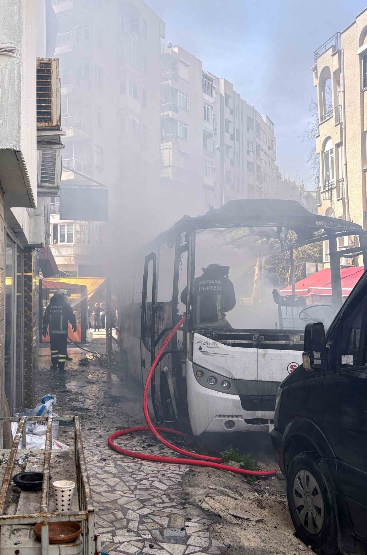 Muratpaşa ilçesi Yüksekalan Mahallesi 504. Sokak’ta park halindeki otobüste saat 12.00 sıralarında yangın çıktı. Otobüsten alev yükseldiğini gören çevredeki esnafın ihbarıyla adrese polis ve itfaiye ekibi sevk edildi. Kısa sürede olay yerine ulaşan itfaiye ekibi, yaklaşık 20 dakikalık çalışmayla yangını, yakınında bulunan araçlara sıçramadan söndürdü. Yangında otobüs kullanılamaz hale geldi.