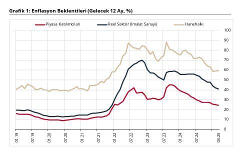 TCMB, Mart 2025 dönemine ilişkin sektörel enflasyon beklentilerini açıkladı. Buna göre; 12 ay sonrası yıllık enflasyon beklentileri bir önceki aya göre, piyasa katılımcıları için 0,7 puan azalarak yüzde 24,6 seviyesine, reel sektör için 0,8 puan azalarak yüzde 41,1 seviyesine gerilerken, hanehalkı için 0,1 puan artarak yüzde 59,3 seviyesine yükseldi. Gelecek 12 aylık dönemde enflasyonun düşeceğini bekleyen hanehalkı oranı, bir önceki aya göre 3 puan artarak yüzde 31,3 seviyesinde gerçekleşti.