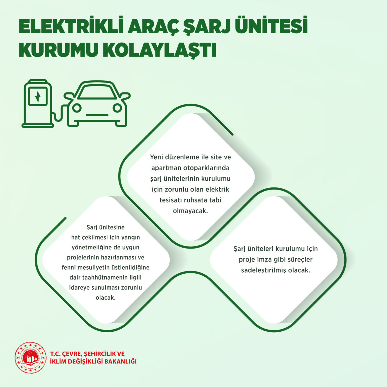 Değişiklikle yerleşim alanlarında elektrikli araçlar için şarj ünitelerinin kurulumu kolaylaştırılacak. Yeni düzenleme ile site ve apartman otoparklarında şarj ünitelerinin kurulumu için zorunlu olan elektrik tesisatı ruhsata tabi olmayacak. Ancak elektrikli araç şarj ünitesine hat çekilmesi için uygulama yangın yönetmeliğine de uygun projelerinin hazırlanması ve fenni mesuliyetin üstlenildiğine dair taahhütname ile birlikte ilgili idareye sunulması zorunlu olacak. Düzenlemeyle elektrikli araç şarj üniteleri kurulumu için proje imza gibi süreçler sadeleştirilmiş olacak.