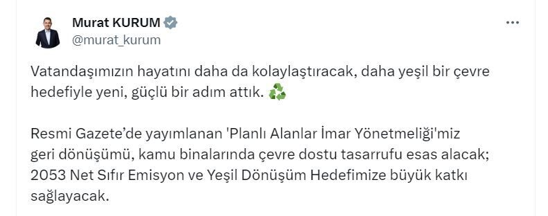 Çevre, Şehircilik ve İklim Değişikliği Bakanı Murat Kurum, yeni yönetmeliğe ilişkin sosyal medya hesabından açıklama yaptı. Bakan Kurum, “Vatandaşımızın hayatını daha da kolaylaştıracak, daha yeşil bir çevre hedefiyle yeni, güçlü bir adım attık. Resmi Gazete’de yayımlanan ‘Planlı Alanlar İmar Yönetmeliği’miz geri dönüşümü, kamu binalarında çevre dostu tasarrufu esas alacak; 2053 Net Sıfır Emisyon ve Yeşil Dönüşüm Hedefimize büyük katkı sağlayacak” dedi.